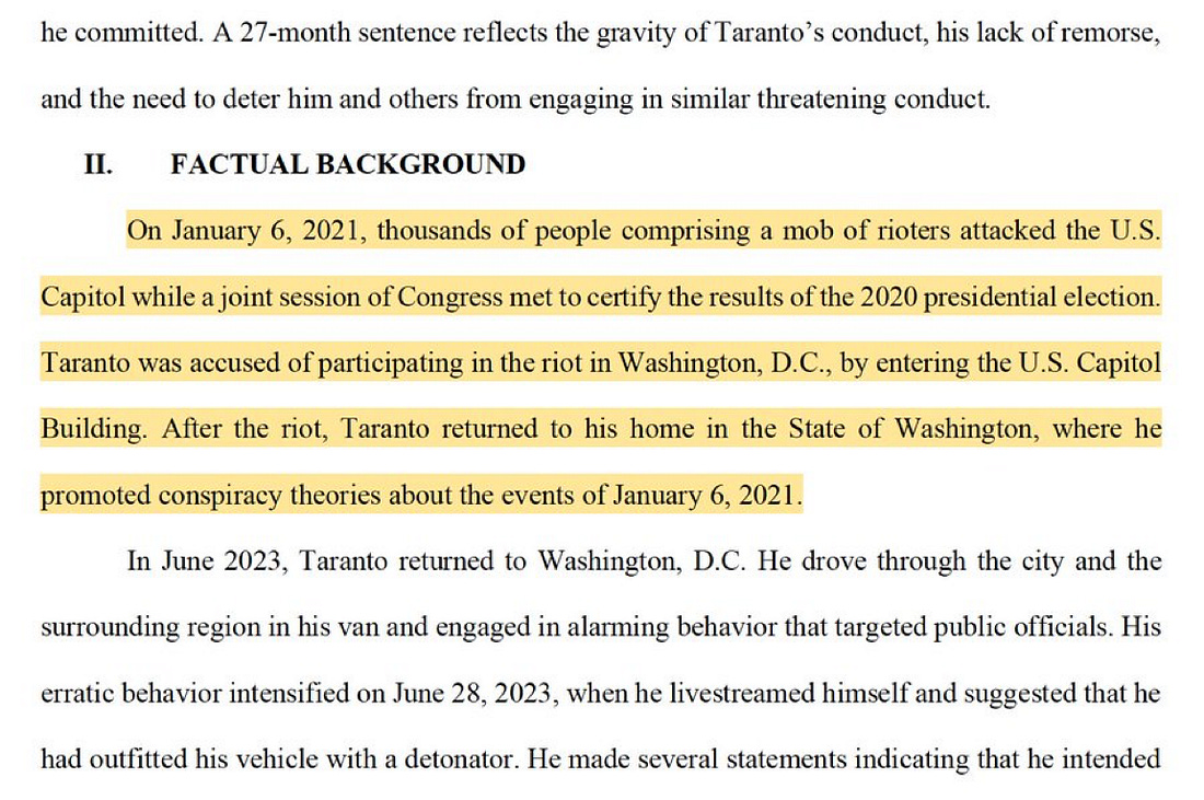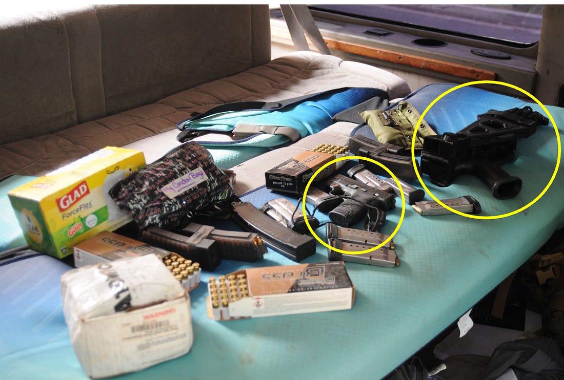 You’ve probably seen or read at least something about the story that is the subject of tonight’s post. If you appreciate having access to an explanation of the federal sentencing process and the kind of context for situations like this that I provide based on 25 years of experience at DOJ as a line prosecutor, an appellate chief, and a political appointee, the U.S. Attorney in North Alabama during the Obama administration, I hope you’ll support my work with a subscription to Civil Discourse. On July 14, 2023, Taylor Taranto, 37, of Pasco, Washington, was charged in a federal indictment with carrying a firearm without a license and possessing an illegal device designed to feed large quantities of ammunition to a firearm. He was also charged with four misdemeanors related to his involvement with events on January 6. The government’s evidence against Taranto included a video that captures him saying, “So we’re in the Capitol Building … legislative building … we just stormed it.” The caption reads: “This is me ‘stormin’ the capitol’ lol I’m only sharing this so someone will report me to the feds and we can get this party rolling!” The charges related to January 6 were wiped out by Donald Trump. But Taranto was convicted on the gun charges in May of this year. Those charges stemmed from an arrest near former President Barack Obama’s home in the District of Columbia. The charges don’t mention President Obama. The Justice Department’s official release indicated that “Prior to his arrest, court documents say that Taranto made several concerning statements regarding the residences in the area and desires to commit acts of violence against a federal facility.” Taranto’s van was searched pursuant to his arrest. He had quite an arsenal with him, including the two weapons circled in yellow below. All told, investigators said they found two guns, a machete and hundreds of rounds of ammunition in Taranto’s van.