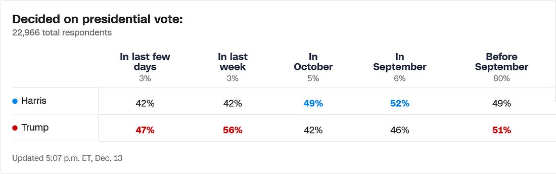 Morning all. We have a week left in the 2025 elections and need to keep working it. Vote early, donate, volunteer - let’s do everything we can to close strong and win these things. Grateful for all the work this community has done but we cannot let up now. We should all be inspired (haunted?) by this data from the 2024 Exit Polls - elections can be won, or lost, in the final week: