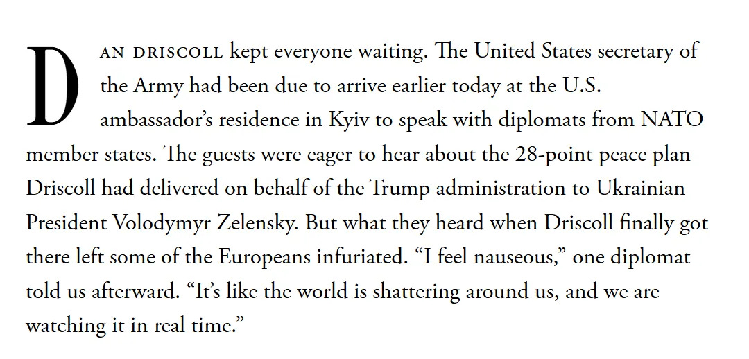 Instead, what actually happened on November 21 was that the Trump Administration came for Ukraine—as they always intended to do. The Secretary of the Army, Dan Driscoll, a very close associate of VP JD Vance, went to Kyiv and tried to bully the Ukrainians into accepting Trump’s 28 Point Plan to neuter Ukraine. Driscoll formally presented the plan to divide Ukraine now, and end it later, and the reality of what Ukraine and Europe was facing finally sunk in. Here was how the Atlantic story on the meeting began.
