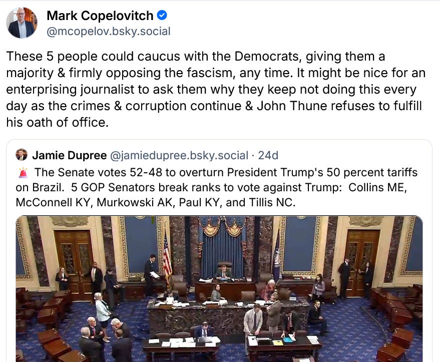 Will Trump’s surrender to Putin be the event that causes a functional bipartisan pro-America opposition to Trump to finally form? We saw early signs of it when the Senate voted three times to roll back his terrible tariffs a few weeks ago. We then saw the American people give a very loud vote of no confidence in him in the November elections. We saw it this week in Congress with the extraordinary 427-1 vote to force him, finally, to stop the cover up and release the Epstein files. We’ve seen it in the warnings and panic coming from Republican political operatives and pollsters that 2026 is shaping up to be a rout. We’ve seen it in the incredible, ongoing transformation of Marjorie Taylor Greene into a leader of the opposition.