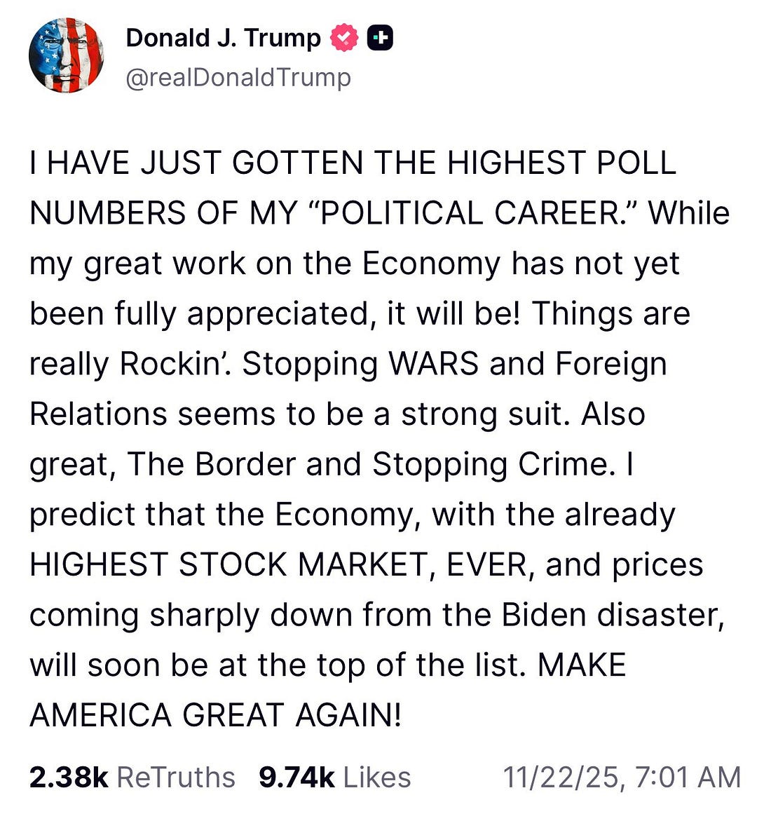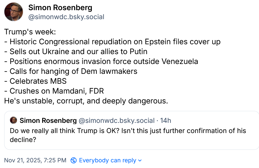 As I wrote yesterday I think the Capital is waking up to what a disaster Trump has been for the country; how unpopular he is; how corrupt and venal; how old, ailing and just delusional and bat-shit crazy he is. It is just too much. He has gone too far. The ridiculous scenes with Mamdani yesterday confirm how erratic and unhinged he has become. As do posts like this from this morning. It is just not clear that he understands what is happening around him any longer, and Congress must step in and start taking the keys away from him: