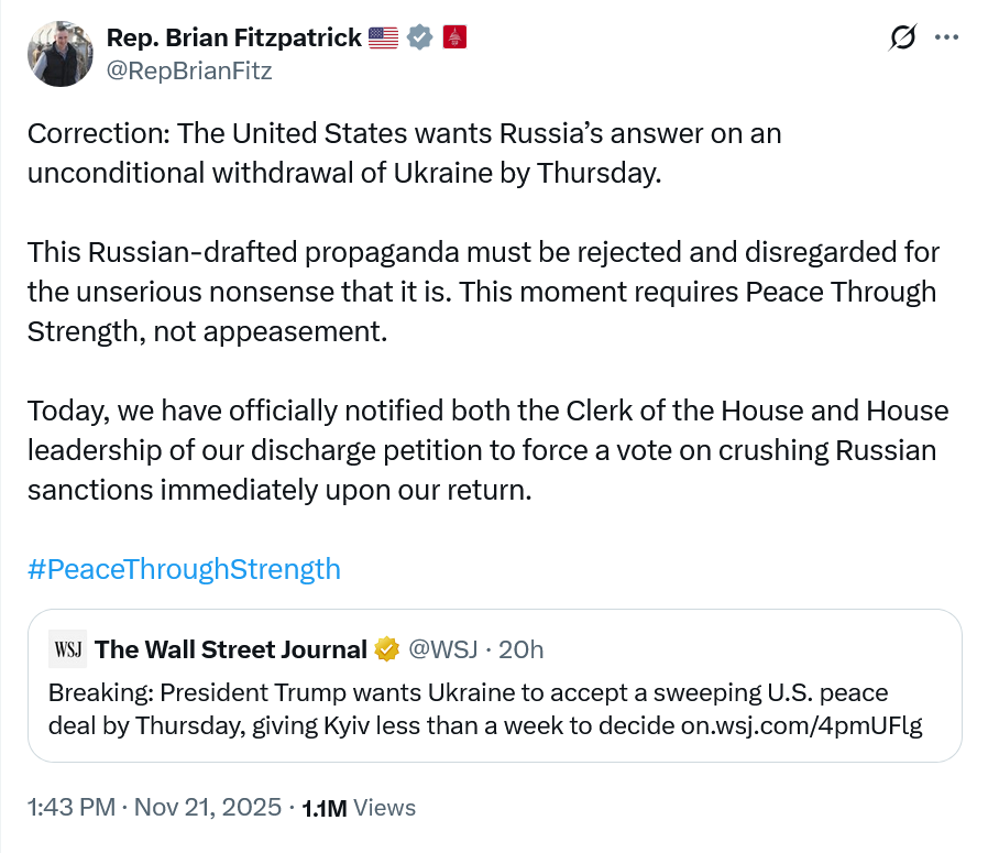 Rep. Brian Fitzpatrick (R-Pa.) said in an X post Friday that he and his allies have “officially notified both the Clerk of the House and House leadership of our discharge petition to force a vote on crushing Russian sanctions immediately upon our return” from the Thanksgiving holiday recess.