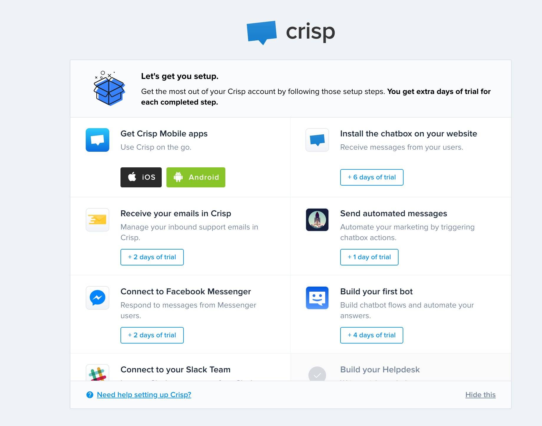 Here's another great example of incentivizing action in user onboarding by Crisp. Crisp Chat adds more days to your trail when you do certain actions. This reduces customers' time to value, nudging them along to take actions that help them experience value from the product. Each action makes customers a little more sticky and less likely to churn in the future. —Corey Swipe Files does not have sponsors. We have partners. We partner with trusted top-tier service providers. In fact, I reached out to them — each one has been carefully selected and vetted so I have 100% confidence in recommending them to you. Doing business with them supports this newsletter. 😊 See how these services can help you grow and mention "Swipe Files" or "Corey" for special treatment: - Conversion Factory — My SaaS marketing and design agency without the BS of unpredictable costs or contracts.