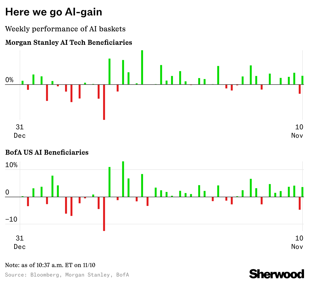 The AI trade is roaring back after getting speed checked last week. Baskets of US AI beneficiaries compiled by Morgan Stanley and Bank of America, which just suffered their worst week since the Rose Garden tariffs announcement, were up big yesterday and led a broad-based market recovery amid optimism that the government shutdown will soon be over. |