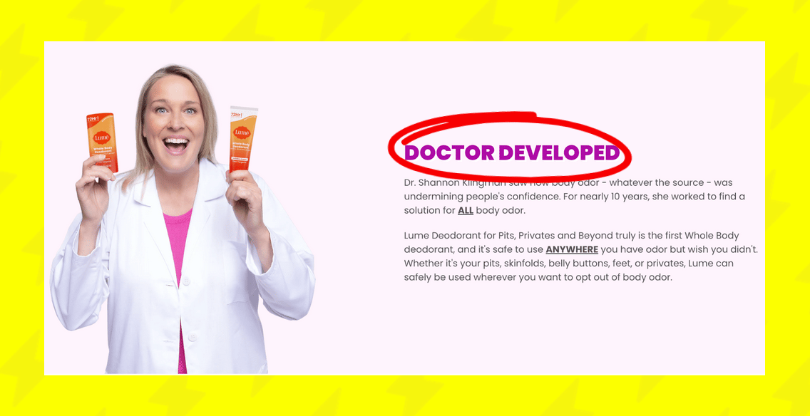 Pairing repetition with authority creates a double-whammy effect. You see "doctor developed" again and again. So each time, it reinforces the idea that this product is actually trustworthy and backed by science, even if you've never looked up Dr. Shannon Klingman. So when you're in the market for a natural deodorant, you're more likely to reach for Lumē.