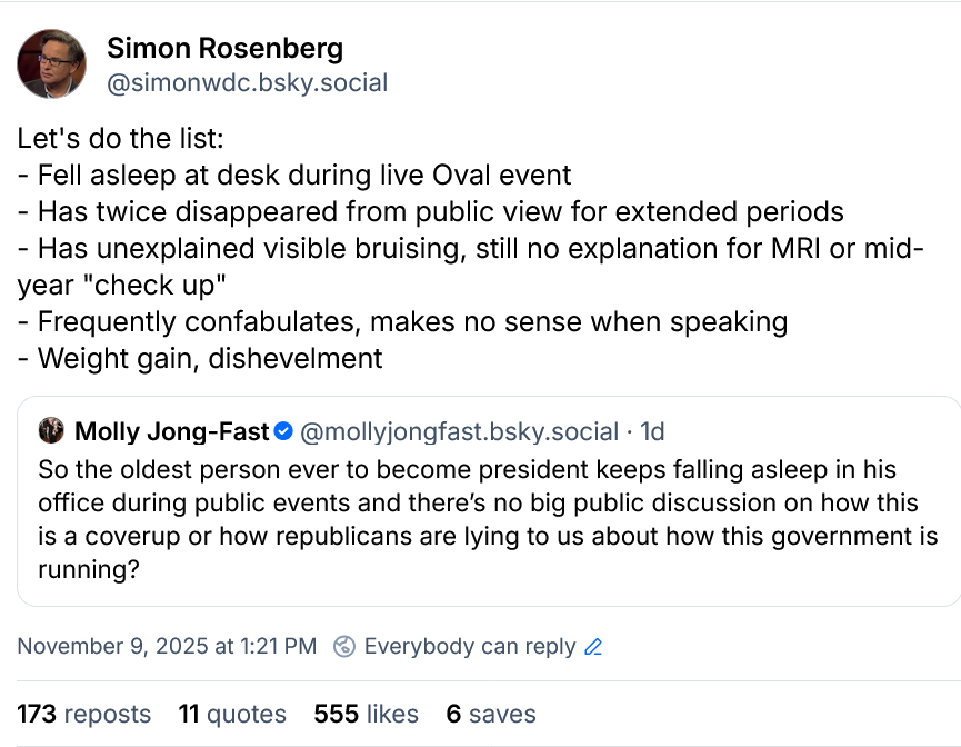 OK. The Senate Voted To Re-Open The Government. What Do We Do Now? Some Early ThoughtsI am going live with Stuart Stevens at noon ET today. Join us - we have a lot to talk about.....Morning all. I first want to thank everyone who worked so hard in the elections last week. It was a big win, and as we move forward in this next challenging period, we need to keep that feeling of accomplishment, of joy, of repudiation - of winning - with us at all times to help us keep moving forward. I obviously do not support what 8 Senate Democrats did last night (here, here), but it happened, and we need to focus now on what we can do to influence what comes next. For we are only in the very early stages getting of both getting “continuing resolution” in place to re-open the government, and in passing a final budget for next year. There are a lot of votes ahead of us in both chambers and days and days of debate. Some notes on where we are now: He is weaker - Trump is historically unpopular, his agenda more so, and he just suffered a huge, humiliating election rout. His government has failed, his health is in decline, his powers are ebbing, and I believe that his malevolent handling of the shutdown these past few months has done lasting damage to his and the GOP’s brand (we will see). In the past few months he has confirmed our essential indictment of him - that he cares about himself and not about us, the country, our democracy, our future. Their control over Congress is very wobbly - Republican majorities in both chambers are historically narrow, their conferences are factious, and the leadership has already started losing important votes (Epstein Files, tariffs). The House must return now to vote on this deal. Adelita Grijalva will be sworn in and the cowardly and pathetic Speaker will somehow have to corral MTG and his conference through what will be a series of tough votes and rancorous debates. We are stronger - in recent months Democrats have made significant gains in measures of our party’s health - Party ID, generic ballot, who is better for the economy, and we just had one of our best elections in the last few decades. We enter this next period stronger, more capable, closer to the American people and with a renewed confidence that when fight we can win and should now act with greater ambition (clearly we need more Dems to believe that now). We need a big conversation in our family about strong and weak, and how to best fight autocracy - Literally every day I think about this data from the 2024 Exit Polls: We will only be where want to be with the electorate if they believe we are strong enough to bring needed change. That when we got to bat for them we will not just try really hard but that we will win. Or as Yoda told us “Do. Or do not. There is no try.” They lost the argument over the shutdown, badly - When government paychecks resume, when air traffic controllers go back to work, when SNAP benefits are fully restored it is far, far more likely that we get credit for being the adults in the room and getting the country back on track. It may be painful to discuss this but we will need to open to taking credit for ending the Trumpian chaos when this is all done (very open to his being completely wrong btw). Last night’s vote was a mistake. But we need to now focus on what comes next, use these next few months to refocus the national discourse on the harms their agenda is doing to the country, and getting as much of our agenda passed as possible. For as I’ve been arguing here for some time the battle over the re-opening the government was only an early battle in a much bigger struggle over the budget and their destructive agenda. This next phase gives us an opportunity to state very clearly what we are for and then go fight with everything we got to get as much as we can for the good of the country and the American people. We need to turn last night’s bitter loss into a consequential winter win for the American people. I want to be very clear about one thing - I believe that in the coming negotiations over the budget we should be fighting for much more than just the restoration of the ACA subsidies. While I applaud our leaders for making this our central demand, it was always insufficient given the extraordinary harm Trump is doing to our country, and his traitorous desire to end American democracy and become a monarch. So, here are some recommendations for things we can do this morning (if you need to take time away I totally understand):