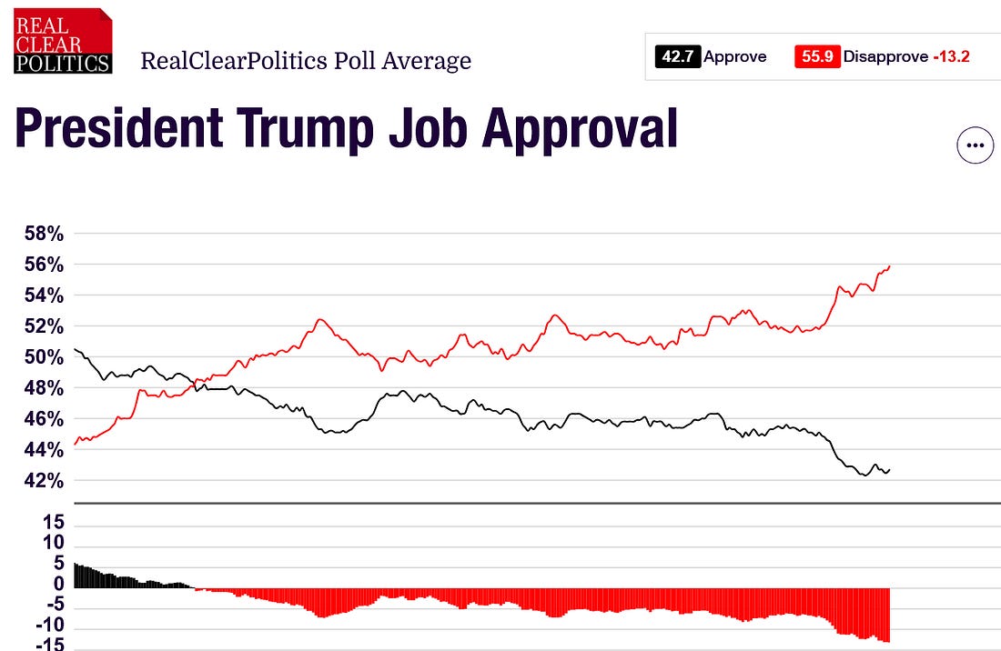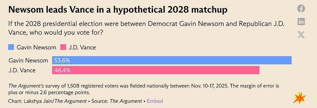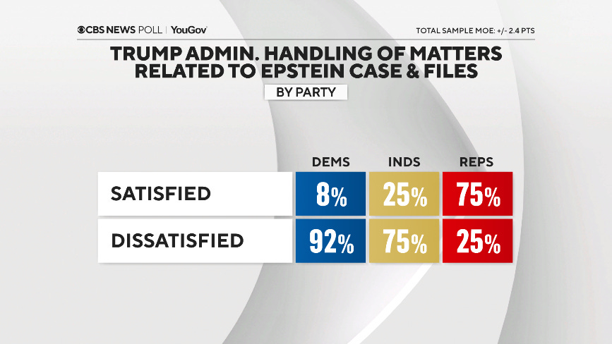 2 - Trump’s job approval in Fox News polling, the most widely seen of all their polls, has gone from 52%-46% in January to 41%-58% last week. This is a 23 point drop!!!!!!!!!!!!!!!!!!!!!!! Look at what has happened to Trump’s job approval in the right-wing propaganda cite Real Clear Politics. In late October Trump’s job approval was -6 (while it was -13 on FiftyPlusOne). Everything was fine in MAGA world. Now look where it is, -13. Everything is all of a sudden very not fine. 3 - The 2025 election was a blow out, and the longer everyone has had to look the worse it has become for Republicans. They are now having to spend money to defend a +22 Trump district in Tennessee, something that portends disaster for them in the mid-terms. Democrats have leads in recent state wide polls in Alaska, Iowa, Maine, North Carolina, and Ohio, and have been competitive in both Florida and Texas. The Republican hold on the Senate is all of a sudden not a given. In the first serious national poll looking at 2028 taken since the election Newsom leads Vance by 8 points, 54%-46%, yet another confirmation that the landscape has shifted between 8 and 12 points towards the Democrats since last year. Republicans are right to be alarmed by what they are seeing, and how hard it is going to be to make things better for them. 4 - A new now-MAGA-friendly CBS News poll released on Sunday has all sorts of deeply ominous stuff for Trump and the Rs. First, he is 40%-60% in job approval, down 8 points since September, and 26 points!!!!!! since February. Two thirds of the country is unhappy with his stewardship of the economy and he continues to be underwater on his signature issue, immigration: Independents are deeply unsatisfied with his ongoing Epstein cover up: But perhaps most ominously for Trump, support for military action in Venezuela is even more unpopular than this management of the economy, suggesting that if he does start wagging the dog this week - and trample all over our Thanksgivings - he and Republicans are going to pay a heavy price and end up even further away for an electorate that is in the process of giving up on them. Now, Let’s Get To Work Everyone!!!!!!!!!!!!!!!!!!!!!!!!!!!In a new essay I talk about how one of the ways we win the 2026 midterms is by providing early support to our candidates and parties to allow them to staff up now, be loud now, define the terms of the debate now, before the inevitable onslaught on AI slop, Russian disinfo, and Trumpian lies funded through bribes and corruption wash across the land. The midterms could be won or lost in these next few months - not in the fall of 2026 - and we need be fighting now with everything we got. Winning The Midterms - Support Our 2025/2026 Candidates