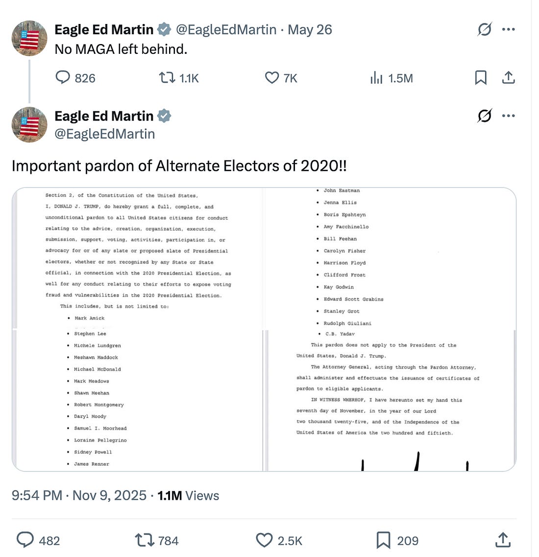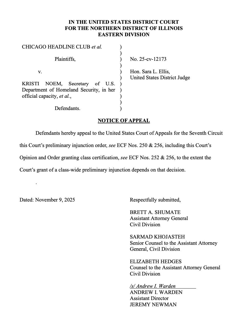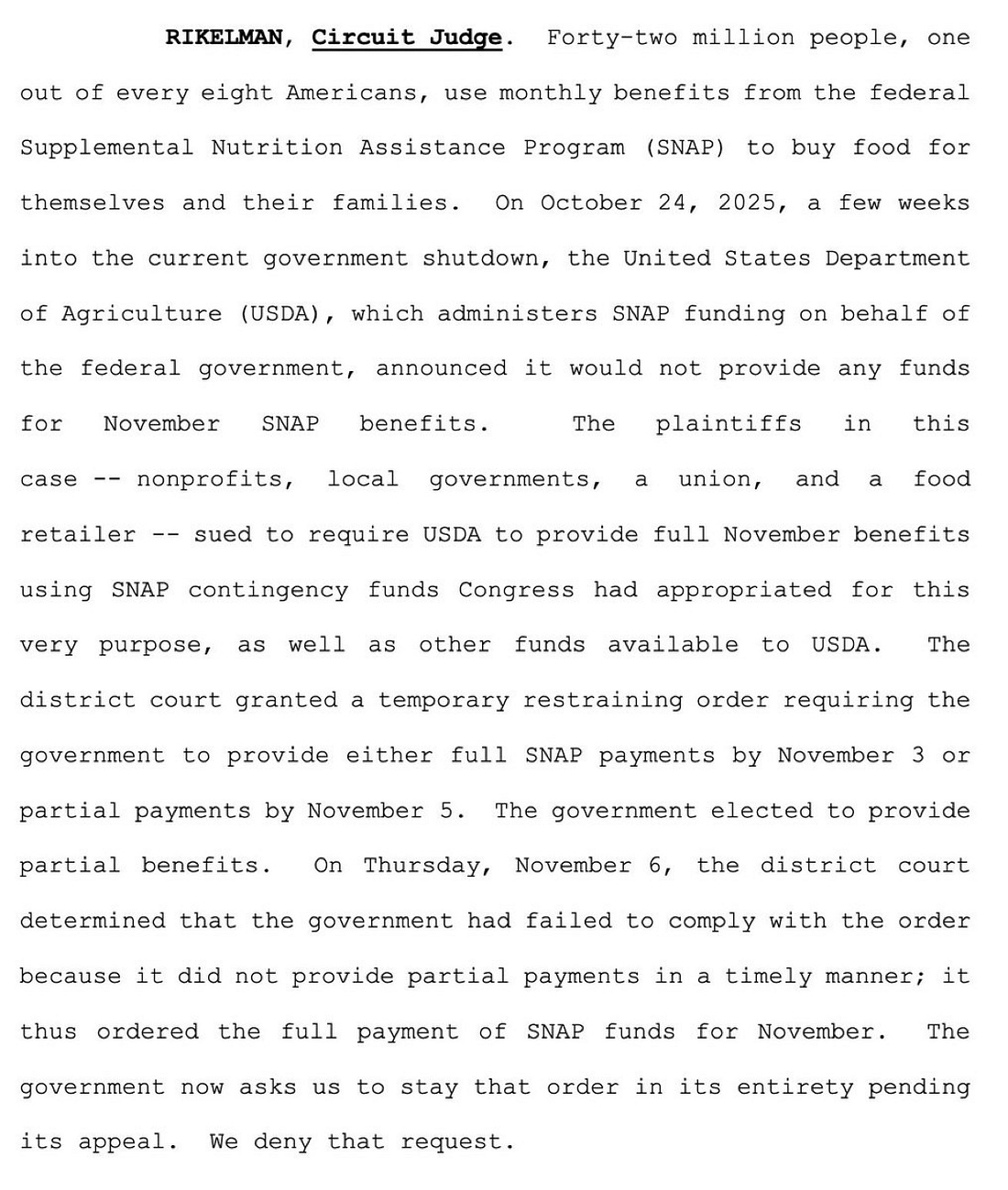 Apparently, Sunday night is the new big news night. To keep us up to date on today's developments, it’s a rare Monday morning update. Late last night, Trump issued pardons. However, it’s an unusual list that leaves us reading tea leaves, because these aren’t individuals being prosecuted by the federal government or even people who are at risk of being prosecuted, given the current administration—those are the people who usually want and need a pardon. These pardons don’t apply to ongoing state prosecutions of fake slates of electors in places like Arizona and Nevada. These names still don’t appear on the White House’s official pardon list. News of the pardons came from a tweet made by Trump’s man at DOJ, Ed Martin. And it wasn’t subtle: “No MAGA left behind.” The list names a cast of familiar characters, including Rudy Giuliani, Boris Epshteyn, John Eastman, Mark Meadows, Sidney Powell, Ken Chesebro, Michael Roman, Christina Bobb, Kelli Ward, and Jenna Ellis. They are all people who advanced Trump’s effort to claim victory after losing the 2020 election. But that’s not the full extent of it. The document Martin posted purports to be a broad pardon, akin to those following the Civil War that pardons everyone involved (although here, there is no requirement to take a loyalty oath to the United States as there was following the war). It’s part of Trump’s ongoing effort to rewrite the history of January 6 and the insurrection and a signal that anyone who serves him will be protected and rewarded. Late last night, the First Circuit rejected the administration’s request for a stay of a lower court order requiring it to make SNAP payments from emergency funds. That left the ball in the Supreme Court’s hands. Justice Jackson promptly issued a briefing schedule that requires both sides, as well as any amici, to file their briefs on the matter today. This proceeding is limited to the question of whether the district court’s order that the administration must proceed with November SNAP payments should be stayed (paused) while the lawsuit proceeds. The First Circuit panel made the stakes plain in its opinion: 42 million people, or one in every eight Americans, rely on these benefits to keep hunger at bay. First thing Monday morning, Justice Jackson issued a briefing order requiring the DOJ to file its response to the First Circuit’s decision by 4:00 p.m. and giving the plaintiffs until 8:00 a.m. Tuesday morning to respond. The government is “the applicant” at this stage of the case. Federal Law enforcement abuses in Chicago. The Justice Department filed a notice of appeal over Chicago federal Judge Sara Ellis’ preliminary injunction restricting the use of force against protesters and journalists. If you stop for just a moment and zoom out, the utter lunacy here comes into focus. The government is fighting for the right to use excessive force against peaceful protesters. Why not take the obvious position that while it disagrees with the Judge’s assessment of the facts, it intends to fully comply with the law regarding treatment of people exercising their First Amendment rights? But that is not the government’s view of the matter. Finally, marriage equality is safe, at least for now. The Supreme Court issued its list of grants and denials on cases from Friday’s conference this morning. The case I wrote to you about last night, involving Kentucky court clerk Kim Davis, who objected to issuing marriage licenses to same sex couples, was on the denial list, so the Court will not hear Davis’ appeal. That means there were not four Justices who wanted to hear the case, which, as I mentioned, doesn’t have particularly attractive facts for undoing longstanding precedent. This denial doesn’t tell us anything about whether the Court might be interested in undoing gay Americans’ rights if the “right” case comes along. Last night, I started the newsletter by writing, “It’s going to be another blockbuster, high-stakes legal week. If you feel a bit overwhelmed, like I did Friday night at dinner when legal opinions were breaking out everywhere while I tried to have a meal with friends, remember that I’ll be here for you all week to try and keep things organized and understandable.” I didn’t expect it to be this soon, but the courts, for a change, are moving at lightning speed. Thank you for being here with me and reading Civil Discourse. We’re in this together, Joyce