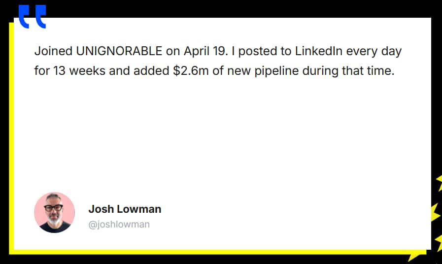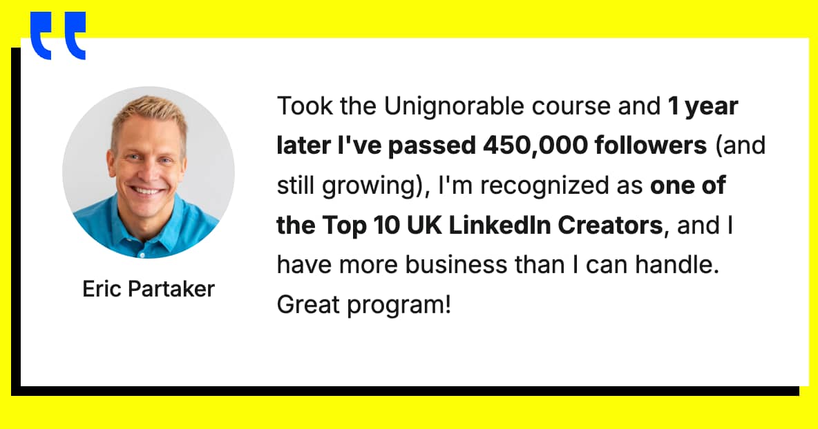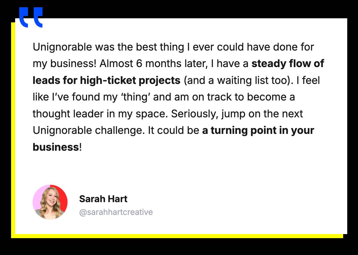 | AI is eating the world. You know that. And now that anyone can create content, marketing campaigns, and even full products blazing fast, there's more competition than ever for *your* ideal buyers' attention. That's why it's never been more important to build a personal brand—and become the authority people know, trust, and *actually* buy from. You know that, too. But… Building an audience is really f*cking hard. You've spent hours painstakingly crafting LinkedIn posts, X threads, and YouTube videos you secretly hoped would go viral... You've applied the advice from "gurus" and maybe have tried their "proven templates"... But your post still only got 5 f*cking views. There's a better way. Ditch the painful trial and error and get the a personal branding course that's helped 1,482 entrepreneurs build audiences that *actually* buy. Right now, you can get instant access to UNIGNORABLE. UNIGNORABLE is the only personal-branding course based on the science of attention and persuasion. So you never have to worry about "hacking" the algorithm or keeping up with flashy trends. (We both know that stuff is B.S. anyway.) Instead, you focus on what's been true for the past 300,000 years and what'll be true for the next 300,000 years: Human nature. You'll identify your best-fit buyers and learn the psychology-based elements to writing scroll-stopping posts for them, including: - Your one-ness – how to cut through the noise and occupy a single, unique space in your buyer's mind