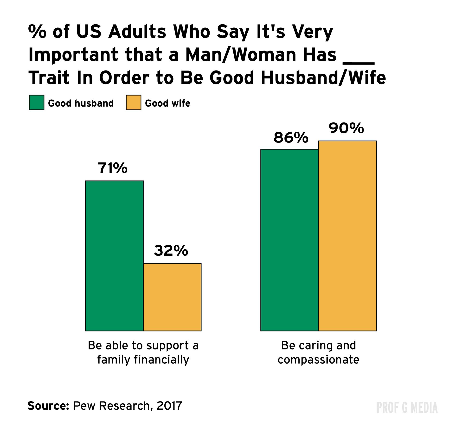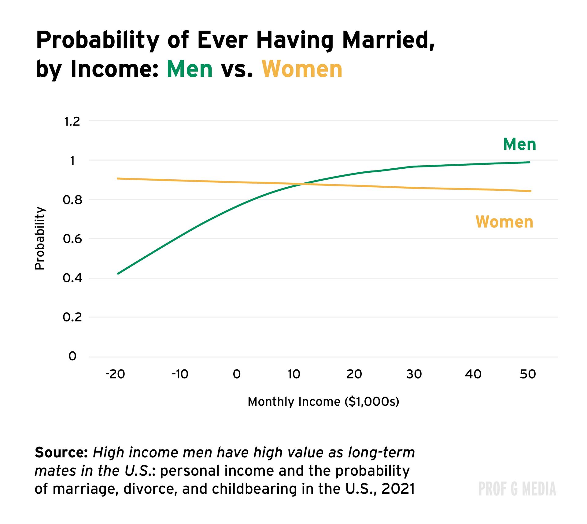 | Research confirms this. In studies of online dating, men who have higher incomes receive 10x more profile visits than men who have lower listed incomes. This dynamic doesn't show up with women. | Furthermore, men in the highest-income category are 57% more likely to get married than men in the lowest-income category. Income is unrelated to marriage for women. | | There isn't just a correlation between money and marriage for men, there is actual data that indicates a causal relationship between men having money and being married. As Lyman Stone, the director of research of the consulting firm Demographic Intelligence, pointed out, when women win the lottery, their marriage rates don't change. But when men win the lottery, they get married. | Money also impacts divorce rates. One study of marriages found that the more time the husband spends unemployed, the higher the likelihood that the couple will get divorced. A woman's employment, or lack thereof, however, has no impact on the likelihood of divorce. |