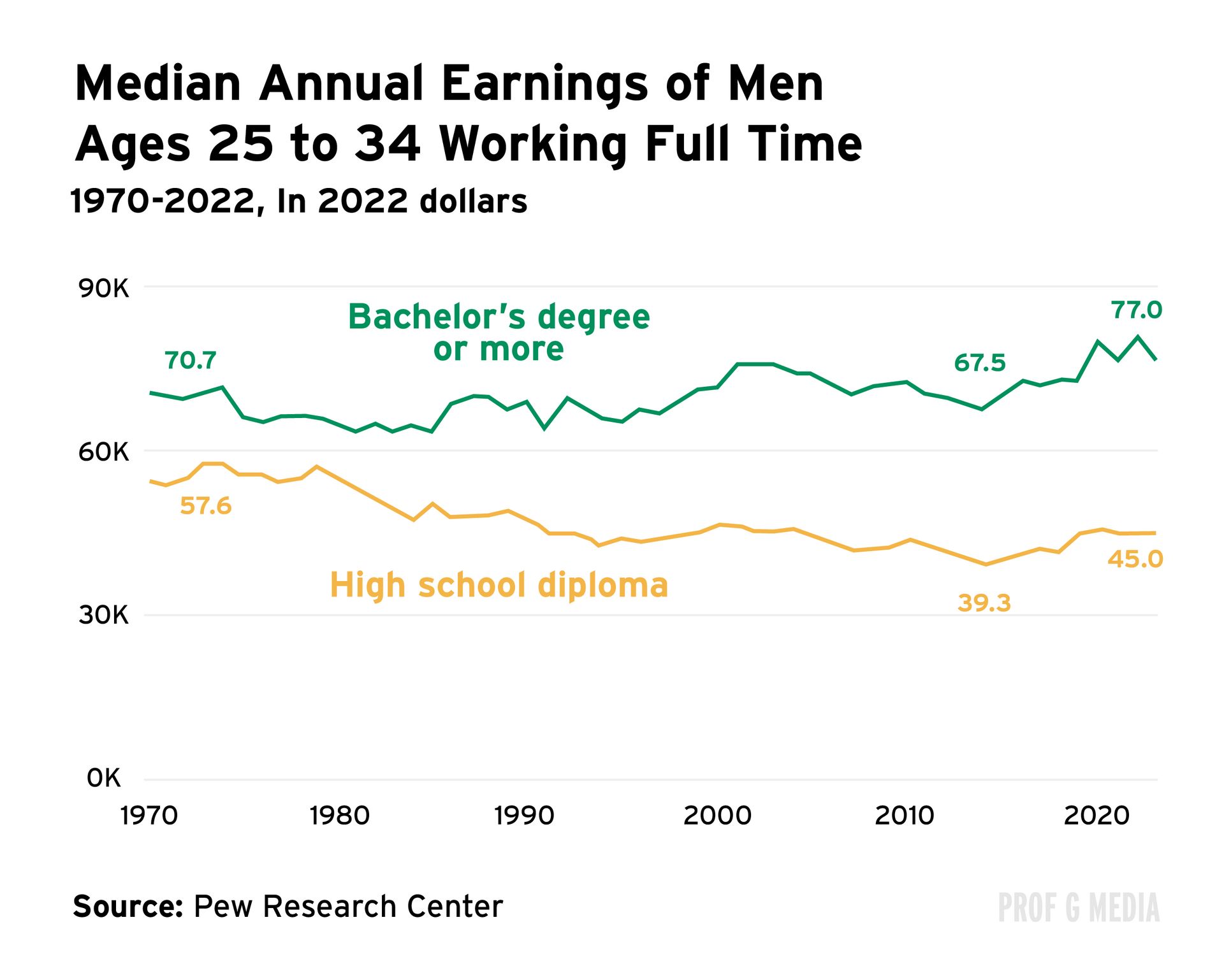 | | Critiques and What It Really Means to Be a Man | A key motivator behind Scott's book was data showing that young men are becoming poorer and increasingly disconnected from society. | Fewer men are graduating from college — only 40% of bachelor's degrees last year went to men. That's less than the percentage of degrees awarded to women in 1970. | The men who don't attend college are falling farther behind. Men without college degrees now earn less, in inflation-adjusted terms, than they did in 1973, per the latest Pew Research data. Young women are earning more. | |