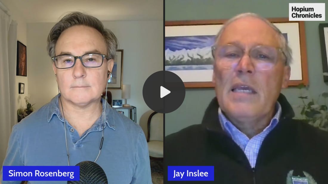 Simon Rosenberg: Hey, everybody. Welcome. Simon Rosenberg, Hopium Chronicles, back with another great event. Today I’m being joined by an old and dear friend, former Washington State Governor Jay Inslee. Welcome, Governor.