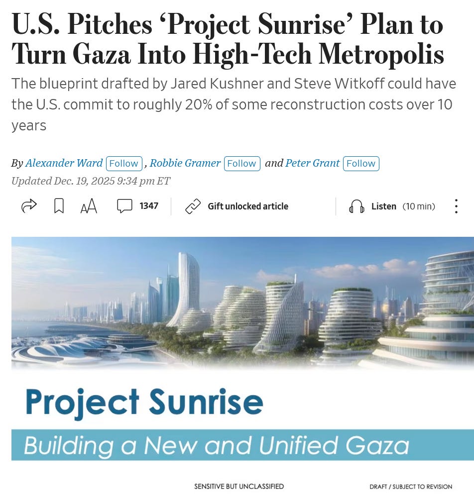 Welcome to “Project Sunrise,” the Trump administration’s pitch to foreign governments and investors to turn Gaza’s rubble into a futuristic coastal destination.
