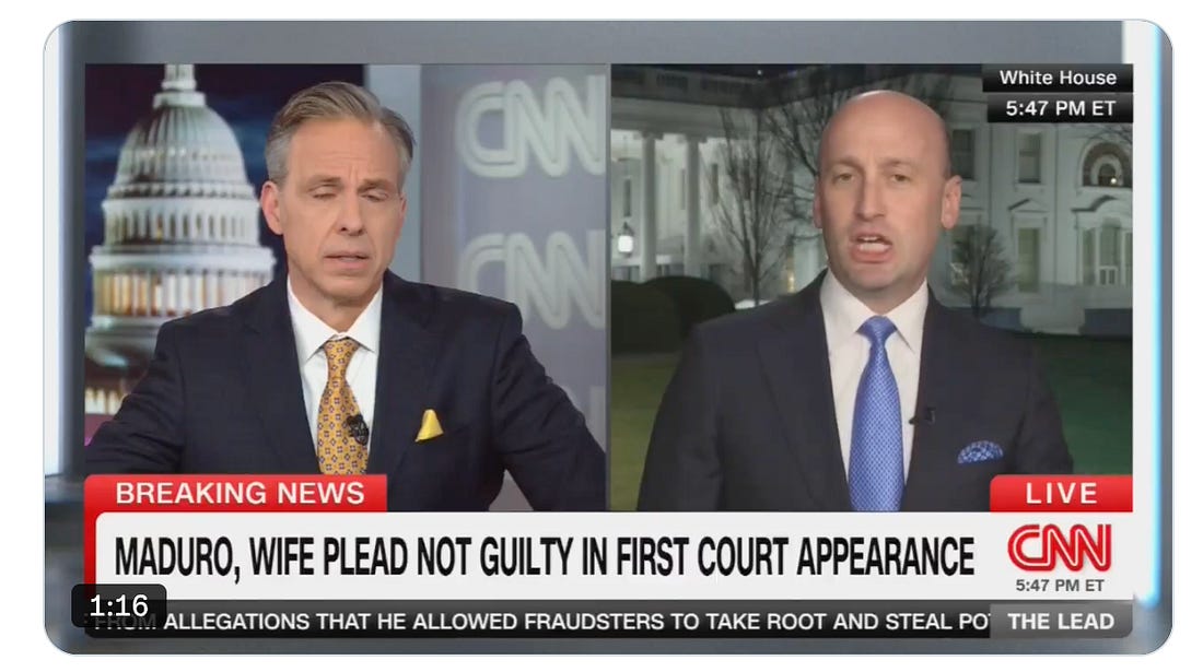 On Monday, Stephen Miller did an interview with CNN’s Jake Tapper. If Karl Rove was George W. Bush’s brain, Miller is Trump’s, well, Miller is the train conductor; he’s the guy who tells us where Trump is headed next. Even as there was still an effort to make out the attack on Venezuela to be some sort of law enforcement operation to arrest a couple of high value defendants, Miller made clear that it was far more, swiping aside the suggestion that Venezuela’s Vice President was running the country. “We are in charge,” Miller told Tapper, “because we have the United States military stationed outside the country. We set the terms and conditions. We have a complete embargo on all of their oil and their ability to do commerce. So for them to do commerce, they need our permission. For them to be able to run an economy, they need our permission. So the United States is in charge. The United States is running the country during this transition period.” Trump seemed to confirm that today, saying we would be involved in running Venezuela for years. The President said, “We will rebuild it in a very profitable way. We’re going to be using oil, and we’re going to be taking oil. We’re getting oil prices down, and we’re going to be giving money to Venezuela, which they desperately need.” Miller’s version was more to the point: Venezuela now needs Donald Trump and Stephen Miller’s permission to continue to exist. If you want to know where we’re headed, listen to what Stephen Miller says and understand what his priorities are. Almost no one thought Donald Trump’s meandering comments about buying Greenland two Christmases ago were serious. The issue hasn’t been on the front burner. But, in what looks like a calculated strategy designed to put that country and Trump’s desire to take it over back on the public agenda, Miller’s wife tweeted about it, on the heels of the strike on Venezuela. When Tapper asked him what his wife’s tweet meant, Miller said the “formal position” of the administration was that Greenland “should be part of the United States.” When Tapper asked if military action to seize the country was a possibility, Miller responded that it wouldn’t be military action against Greenland and continued, “The real question is, by what right does Denmark assert control over Greenland? What is the basis of their territorial claim? What is their basis of having Greenland as a colony of Denmark? The United States is the power of NATO, for the United States to secure the Arctic region, to protect and defend NATO and NATO interests. Obviously, Greenland should be part of the United States.” Switching back, Tapper asked Miller if there should be an election in Venezuela. As previously, he didn’t get a direct response. “The United States is using its military to secure our interests unapologetically in our hemisphere. We're a superpower. And under President Trump, we are going to conduct ourselves as a superpower. It is absurd that we would allow a nation in our own backyard to become the supplier of resources to our adversaries, but not to us, to hoard weapons from our adversaries, to be able to be positioned as an asset against the United States rather than on behalf of the United States.” When Tapper interjected that sovereign nations should be able to do as they please, Miller’s response was stark. “The Monroe Doctrine and the Trump Doctrine is all about securing the national interests of America.” He’s pompous. He’s a lot of other things. But his ideas have informed where Trump is headed ever since he abandoned his soon-to-be disgraced and fired patron Jeff Sessions, and hitched himself to Trump during his 2016 campaign. Miller brought the same anti-immigrant fervor to Trump that he had supported during his time with Sessions. It’s that sad fear of people who are different that has brought us to a moment where the sight of ICE agents marching down American streets is as much a threat to American citizens as it is to people here without legal immigration status. Trump has always been transactional in his relationships, casting off people who no longer suit him. But Miller has had staying power and his priorities have currency. His vision of the future is unabashedly that of a strongman. “The future of the free world, Jake, depends on America being able to assert ourselves and our interests without apology.” “We live in a world, in the real world, Jake, that is governed by strength, that is governed by force, that is governed by power,” he said. “These are the iron laws of the world since the beginning of time.” Listen to Stephen Miller, because he signals where Trump is headed. It’s all about power, U.S. power. Donald Trump’s power and Stephen Miller’s power. TAPPER: “But you invaded the country. We went into the country and we seized the leader of Venezuela.” Nobody elected Stephen Miller. But Steve Bannon, who is a Miller ally, describes him as Trump’s “prime minister,” someone who is a player for this administration on all of the issues that are most important to him, including immigration and border security, national security, foreign policy, trade, military action, and policing. Miller fancies himself as a polymath, an expert in all things, but it’s far less likely that it’s that which keeps him in Trump’s good graces than it is the one quality Trump values above all else: loyalty. Miller is always in step with Trump, even when he’s explaining what he needs, and above all, he supports Trump’s vision of a muscular presidency with far more power than anything the Founding Fathers envisioned, anything that’s healthy for a democracy. Tonight, Katie Miller is back on Twitter, objected to ChatGPT’s assessment that ICE is responsible for the shooting death of Renee Good as “dangerously woke.” Meanwhile, Miller tweeted, “The Democrat Party has spent months inciting insurrectionist 