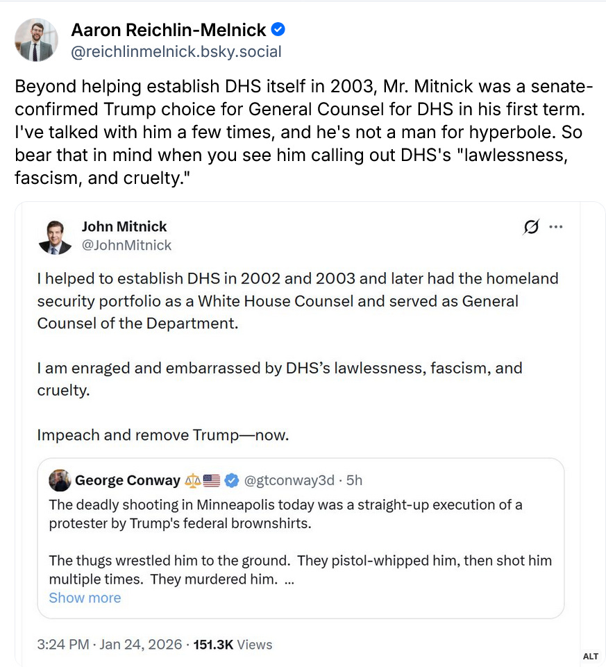 A very influential Republican Homeland Security professional, John Mitnick, who served in the first Trump government, has called for Trump’s removal over DHS’s ”lawlessness, fascism, and cruelty”: