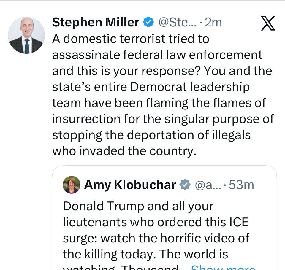 I don’t know what’s going to happen this week. Trump-Miller retreated and were humiliated last week on Greenland, their big global play. I have a hard time believing they are going retreat here, again, particularly after Miller’s completely unhinged statements yesterday: