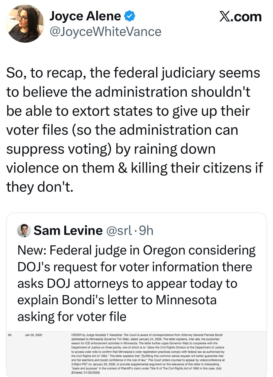 After a long, difficult weekend, following the murder of Alex Pretti on Saturday in Minneapolis, which followed the murder of Renee Good earlier in the month, there is more evidence that when we protest against this administration and stay the course, we prevail. We cannot give up, and Americans don’t look like they intend to. Instead, with a lot of grit, they are staying the course. There is more I want to write about the death of Alex Pretti once I finish processing everything that happened this weekend. I think we’re all still processing, but also, it’s a moment that demands action, so we have to be able to do both of those things at once. We saw the shameless, untrue, demeaning propaganda DHS spouted about Pretti. There is the failure to acknowledge a tragic mistake, to show empathy for his family, to take steps to take the temperature down—all things this administration must be held accountable for at the highest levels. But today, I want to write about the little bit of light shining through the dark. Trump is backing down. His Attorney General Pam Bondi’s offensive offer—give us your voter files, she said to Minnesota, and ICE will leave—was called into question by Judges in Oregon and Minnesota. It was clear the judges had questions, but they weren’t alone. In the wake of the administration's lies about Pretti, protests erupted across the country. Americans called for an unbiased investigation after reporting emerged that ICE refused to let state and local investigators onto the scene at first, and then abandoned it without securing it, which compromised other agencies’ ability to gather evidence. With protests ongoing across the country, the administration is slowly backing away. On the Sunday shows, in addition to Democrats, Oklahoma’s Republican Kevin Stitt said Trump needed to answer questions about pulling ICE out of Minnesota and opined “He’s getting bad advice right now.” On Monday, Texas Governor Greg Abbot said on a local radio show that "They, being the White House, need to recalibrate on what needs to be done to make sure that respect is going to be reinstilled," and that they had a plan to do that. Congressional Republicans, including Representative Michael McCaul of Texas and Senators Thom Tillis of North Carolina, Bill Cassidy of Louisiana, Susan Collins of Maine, and Lisa Murkowski of Alaska, called, in varying degrees, for more investigation. That’s about as much backbone as we’ve seen from Republicans in the past year. It was clear to Republicans that Americans had no intention of letting this go. Tonight, it appears that the days of Gregory Bovino strutting around Minneapolis streets in his greatcoat may be over. The Atlantic reported earlier tonight, “Greg Bovino Loses His Job.” They wrote that he had “been removed from his role as Border Patrol ‘commander at large’ and will return to his former job in El Centro, California, where he is expected to retire soon, according to a DHS official and two people with knowledge of the change.” DHS is denying that the report is true. But as Adam Klasfeld of All Rise News posted, “Nothing in this carefully worded statement by DHS denies the crux of the reporting that Bovino was demoted to his previous job, lost social media access, will leave Minnesota and may retire soon.” Of course, removing Bovino alone is not the answer, but it’s a start. And we the people did that. We cannot let up, we have to keep going. As I wrote to you last week on Martin Luther King Day, peaceful protest is the answer. “Bull Connor’s ghost is walking the streets of America in the guise of Donald Trump and others around him, Kristi Noem and Thomas Homan, people who reject country and Constitution. People who have no appreciation for our system of government or our rule of law, but who think only of themselves. We don’t talk enough about how not-normal this is. We all know it, it’s become an accepted truth. Let’s honor the legacy of peaceful protest by speaking that truth to power. Because we love our country. And we intend to take it back in this election year.” This week, Americans did just that: we spoke truth to power. In the immediate wake of Pretti’s death, DHS Secretary Kristi Noem and others, including the President, tried to demean his character and call him a terrorist. But it quickly became apparent that Pretti was holding a phone, not a gun, and was trying to save another protestor, a woman, who was being attacked by an agent. He wasn’t there to massacre law enforcement. He was a VA ICU nurse. He was there to help. As Connecticut Senator Chris Murphy tweeted, “It should freak the American people out that Trump, Noem and Bovino lie so enthusiastically. He wasn't ‘brandishing a weapon’. He wasn't attending a ‘riot’ or ‘interfering in a crime scene’. He was an ICU nurse exercising his constitutional rights.” In the course of victim-blaming, Noem and Bovino accused Pretti of brandishing a firearm. “Brandishing” is a term taken from a federal statute that criminalizes the use of a firearm to commit certain types of crimes. It means to display all or part of the firearm, or otherwise make the presence of the firearm known to another person, in order to intimidate that person, regardless of whether the firearm is directly visible to that person. I’m sure you all have seen the video. Pretti is surrounded by agents after he attempts to come to the aid of another protestor. He’s forced to the ground and they appear to be dragging him—we don’t know if they had both of his arms immobilized, but that seems likely from what is depicted. Pretti was carrying a firearm he was legally entitled to have, the Second Amendment at work. His shirt came up, revealing it. An agent removed it. None of this is a license to shoot and kill, especially under these circumstances. Pretti was not even capable of “brandishing” at that point. He was incapable of displaying a fi