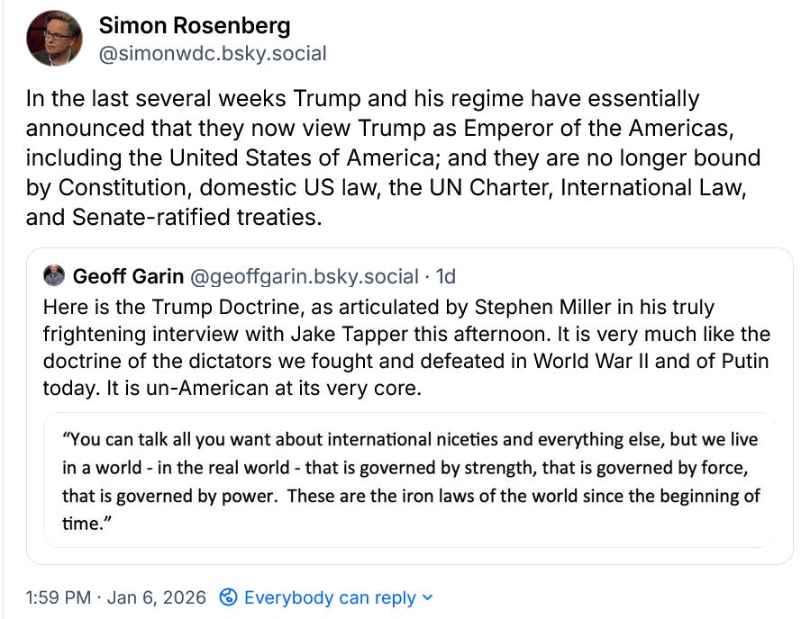 All Hail Our New Emperor Of The Americas, Pepper Joins The Acton Ticket In OH, Mark Kelly Is A Great American PatriotHopium Paid Subscribers Gather Tonight at 7pm EST, Founding Members Friday at 130pmMorning all. So here we are. Frustrated by the dramatic failure of his domestic agenda, of his soaring unpopularity, of the stunning blue wave that brought election blow outs of his party across the country this fall and winter, of his struggle to contain the Epstein scandal, of the fraying of his Congressional coalition, of his declining health and ebbing powers, our ailing and unhinged leader has turned his attention abroad, declaring himself Emperor of the Americas, Lord of the Western Hemisphere. As such, our leader has determined and decreed, that the Constitution, domestic US law, the UN Charter, international law, and Senate ratified treaties with other nations no longer apply in our new Imperial age. The era of law is behind us now. American democracy, the post WWII rules-based order, the Four Freedoms, Pax Americana are now relics of a bygone era. We are entering a new age now. An age of force, of power, of MANLY STRENGTH. Stephen Miller declared the arrival of this new age on CNN on Monday night. Here are his words: