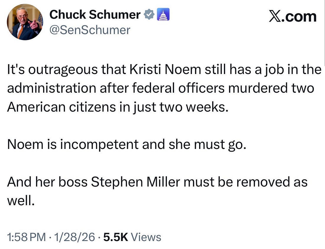 This is a good list. It’s meaningful reform. What happens next? Who knows, but man do we need to be loud today. Call your Senators and House Rep, demand they fight to pass this package and rein in ICE. Don’t buy this bullshit fake “de-escalation” from the White House. It is important to note that yesterday Senator Schumer made an additional demand, something that we’ve been discussing here for days - Stephen Miller must go.
