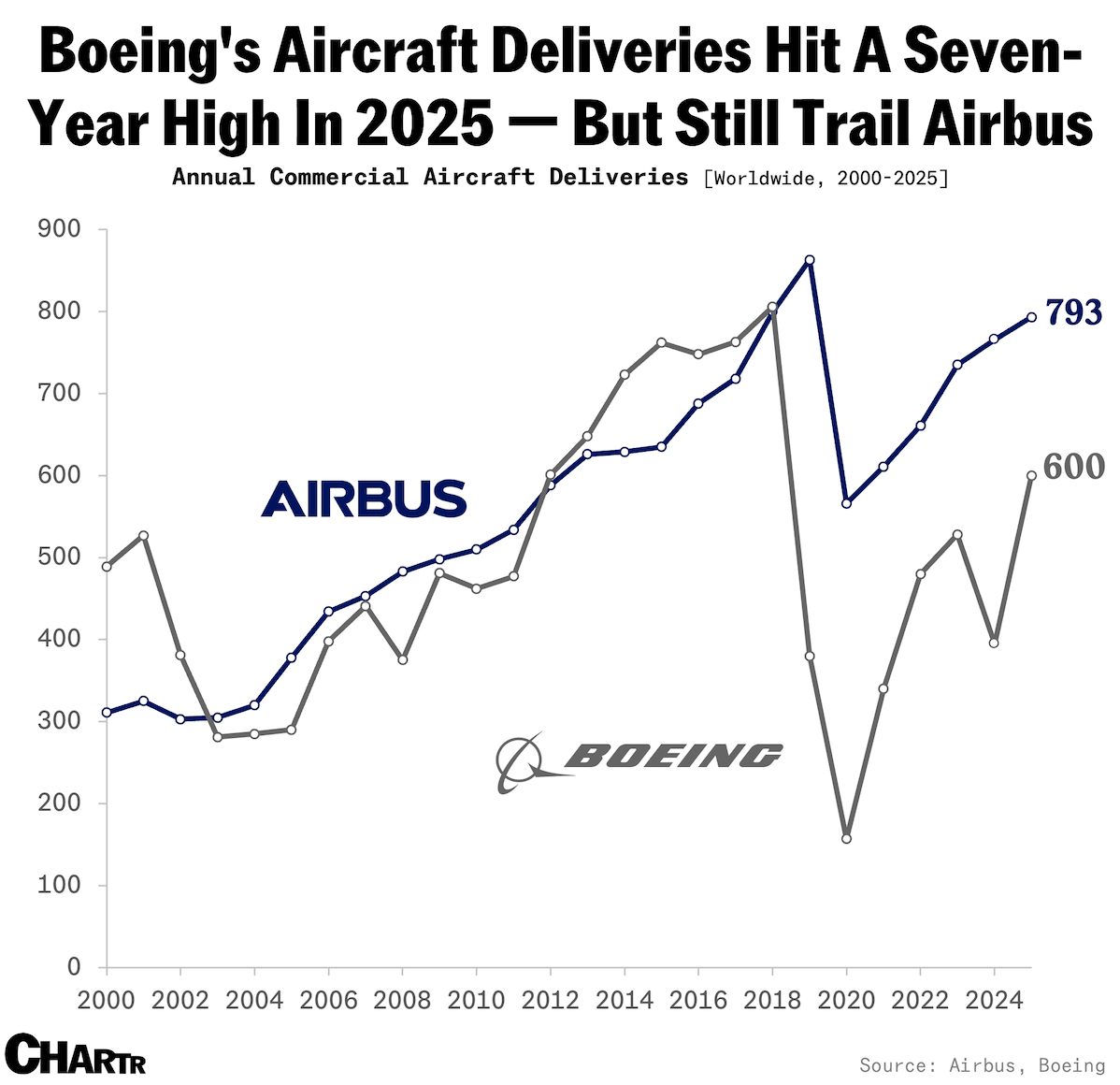 For the first time in seven years, Boeing is finally back on top in the plane-making industry, at least in terms of orders, after years of production disruptions and safety crises. The Seattle-based company racked up 1,173 net aircraft orders in 2025, beating its European competitor Airbus' 889 orders and reclaiming the sales crown for the first time since 2018. The surge was driven by a string of airline deals, often announced alongside government-led trade negotiations — including the company's largest-ever order from Qatar Airways, which was revealed during President Trump's Middle East tour. Boeing's aircraft deliveries — often the more important metric for plane makers, given that they receive most of the payment for the jet upon handover — also climbed to their highest annual total since 2018, having delivered 600 planes last year. Still, that figure lags Airbus' 793 deliveries, as industry-wide engine shortages continued to delay output and added to Boeing's lingering issues. |