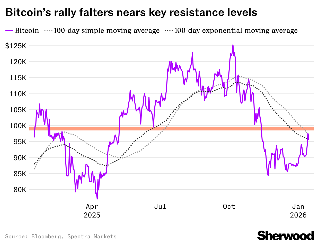 "Bears can get busy as we near the 98400/99400 zone, or bulls can add on a break of 100k," wrote Brent Donnelly, president of Spectra Markets. Read more. |