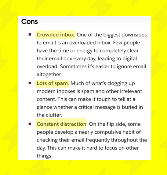 Content marketing Puncture the myth that a past method is superior Slack published a blog post titled "Is email dying as a business communication channel?" that acknowledged email's reign in business communication for decades. But instead of letting customers totally romanticize "the way we've always done it," Slack created a pros and cons list, highlighting the annoyances people conveniently forget about using email. Y'know—things like crowded inboxes, constant distractions, and messages that create more confusion than clarity.