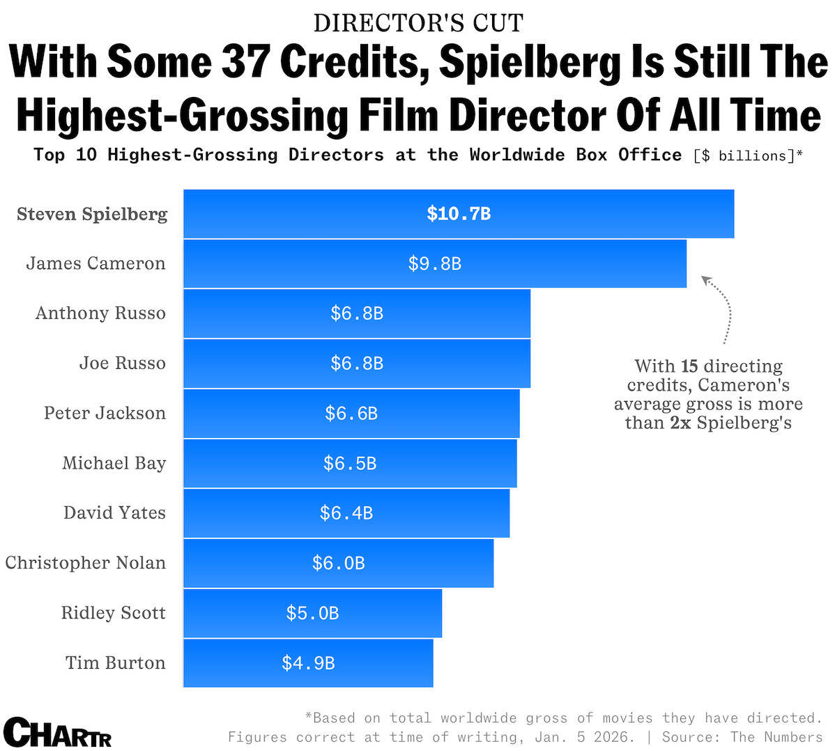 According to The Numbers, Steven Spielberg, the legendary filmmaker behind "Jurassic Park" and "Indiana Jones," is the highest-grossing director of all time, accruing ~$10.7 billion across an astounding 37 directing credits, not inclusive of the many producer credits to his name (and not adjusted for inflation). With "Avatar: Fire and Ash," Cameron has now pulled in a total of ~$9.8 billion over 15 directing credits, bringing his average gross to ~$653 million. While this is still slightly less than the average reported for the Marvel-directing Russo brothers, among others, if the latest "Avatar" keeps momentum to exceed $2 billion like its predecessors, Cameron could rise up both rankings. |