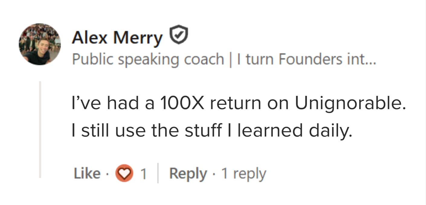 | Happy New Year! I'm gonna go out on a limb and guess "build an audience" is somewhere on your 2026 to-do list. But you don't have 3 hours a day to devote to social media. (And even if you did, you'd rather do literally anything else. Like stand in line at the DMV, watch paint dry, or read the Iliad.) Sarah Hart was in the same position. Today? Sarah is one of the most trusted voices on visual branding on LinkedIn. You might even recognize her profile… But back in 2024, she was a new mom coming back from mat leave. She had *very* little time to commit to posting on social media. In between naps and newborn feedings, she had to focus on client work—y'know, the thing that actually pays the bills. She couldn't waste time creating social posts that only got 5 views. *whomp whomp* She wanted to build an audience and attract more clients. Sarah knew being fully reliant on referrals was dangerous, so she was ready to commit to LinkedIn (finally). But she also knew she couldn't waste months—or years—posting into the void and hoping something clicked. That's why she joined UNIGNORABLE. Instead of chasing trends and trying to "hack" the algorithm, she learned timeless psychological principles—aka the stuff that hasn't changed in 300,000 years. She learned how to finally write content that her ideal clients actually cared about and positioned herself as the go-to expert in the design space. … without spending hours on social media or racking her brain every time she wanted to post something. Here's what she said about UNIGNORABLE at the end of 2024: She recently gave me an update of how her business is a year later—at the end of 2025: Sarah's booked solid and has hired a few new team members. Why? Because she's about to go on her second mat leave. Only this time, she has a full waitlist of clients ready to work with her team. That means she can take 3 months off while her business—and income—keeps rolling. Sarah doesn't need to chase clients anymore—they show up pre-sold, ready to work with her. Less stress. Lots more predictability. That's what happens when you build an audience the right way. 1,482 smart entrepreneurs, including Sarah, have already built personal brands that people *actually* buy from using the timeless psychological principles we teach in UNIGNORABLE. And Sarah isn't the only alumni who has called UNIGNORABLE the best thing she's ever done for her business. Susan has, too. And so has Shanna. But wait—there's more! Sound too good to be true? I get it. There's a LOT of noise and big promises being made in the personal-branding space right now. But *this* course? It's based on psychology-backed principles. And according to those 1,482 smart entrepreneurs, *that* makes all the difference. Discover what even more UNIGNORABLE alumni had to say > (Just scroll down to "What students say about the UNIGNORABLE challenge.") With ♥️, P.S. This is the first and last time we'll ever offer the full UNIGNORABLE curriculum. 387 people grabbed the course in the last 48 hours. And once doors close on Jan. 2nd at 11:59 p.m. EST, it'll be locked away in the vault… forever. So to encourage you to actually *build* your personal brand (instead of having it wither away on your to-do list throughout 2026)... We're offering fast-action pricing deals and vanishing bonuses. There are only 4 spots left for Tier 1. Wanna see what special pricing and bonuses are available today? Check this page out before the price goes up > Not interested in building a personal brand right now? No problem. Click here to mute all UNIGNORABLE emails. |