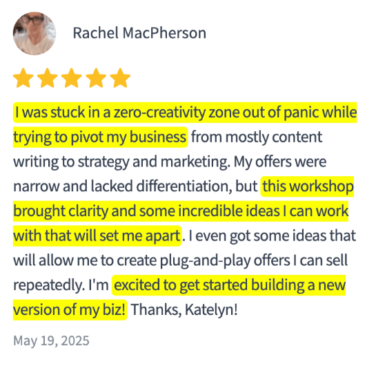 Claim these special bonuses and 41% off now > P.P.S. If you're tempted to grab Offer Breakthrough but past online courses have left you skeptical, I get it. I genuinely want you to nail down an offer that finally works for your business and life. That's why this hands-on workshop comes with a 14-day money-back guarantee. Try it and see if you like it—100% risk-free. But if you're anything like Rachel or Angelina, then I have a feeling you're gonna la-la-looove it. Take advantage of my special b-day deal before it expires in 3 hours > |