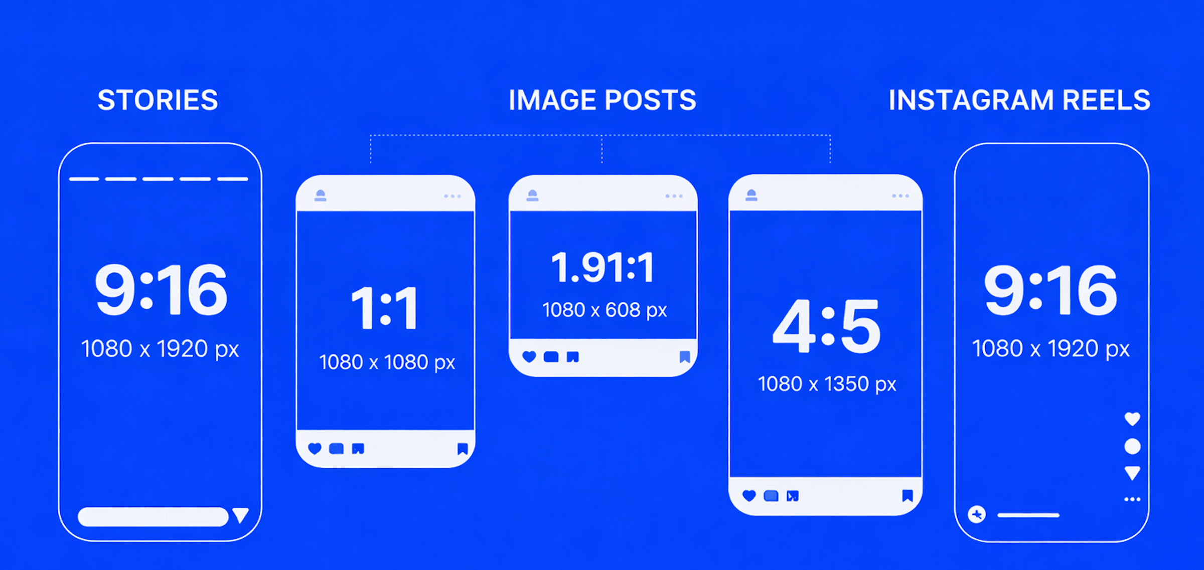 Instagram Feed crops square images differently than Facebook Feed. Reels push content upward because of interface elements at the bottom. Stories reserve space for controls and CTAs.