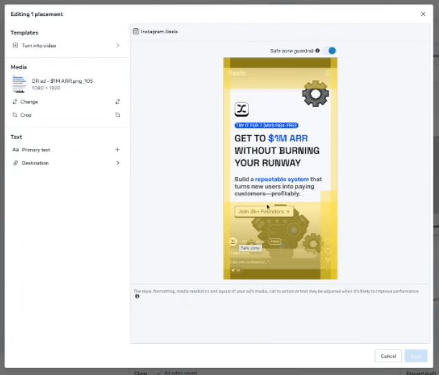 There's an easy step to make sure your ads always look sharp. When you edit placements in Ads Manager, Meta shows you a yellow "safe zone." That's the area you actually control.