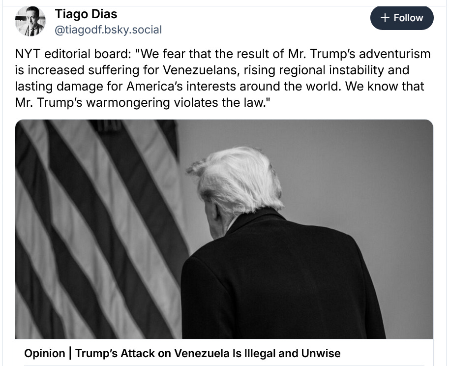 Did Trump, in another one of his delusions and confabulations, just imagine himself as the new ruler of Venezuela this morning? How does someone get something like this so wrong? And if Trump did invent something of this import, how can he be allowed to keep running the country? Trump’s shocking throwing of the Nobel Peace Prize winning opposition leader, María Corina Machado, under the bus this morning may have encouraged the remnants of the Maduro regime to decide to fight it out today. For Trump, in all of his idiocy, just kneecapped the global face of the opposition movement, claiming somehow she had no support despite her party winning the last election. Here’s the NYT just now, same gift link: