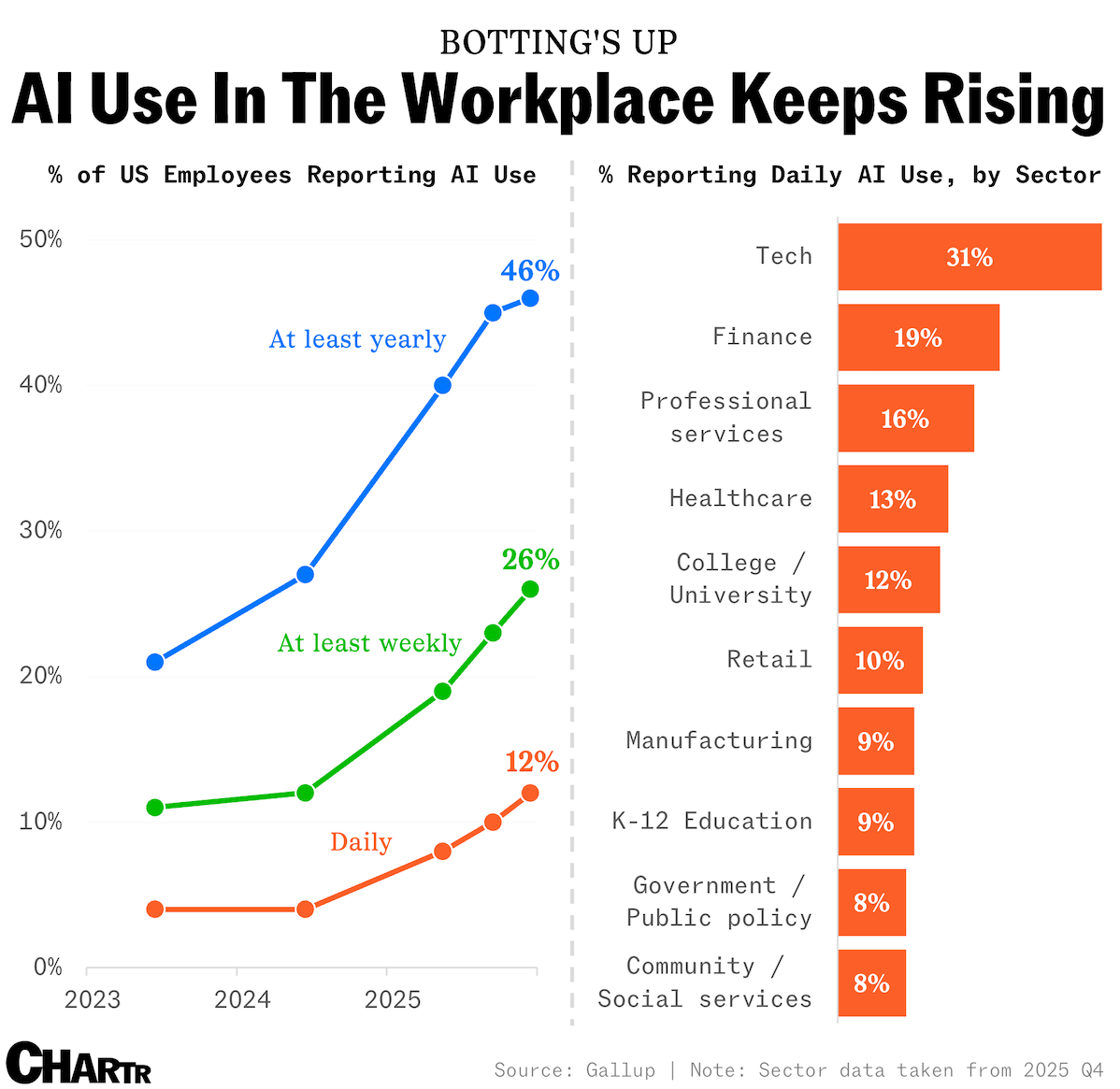 When Anthropic this month announced Claude Cowork, an AI agent designed to help the everyman's working day run a little smoother, it certainly caused a splash, sinking software stocks and scaring the life out of startup founders around the world. Per a new Gallup survey, however, the American workforce has already been getting more hands-on with the tech, even BC (Before Cowork). According to the findings published yesterday, AI use in the workplace continued to rise in the last quarter of 2025, with the share of daily, frequent, and total users all growing in Q4. Indeed, in only about 2.5 years, the percentage of US employees who use the tech every day in their professional lives has tripled, while the share of those using it at least "a few times a week" or at least "a few times a year" have both more than doubled as well, per Gallup's latest data. Still, whether the rise (and rise again) of the machines that help people to get their jobs done comes as any big shock to you likely depends on your office, your company, or even the industry that you work in. |
