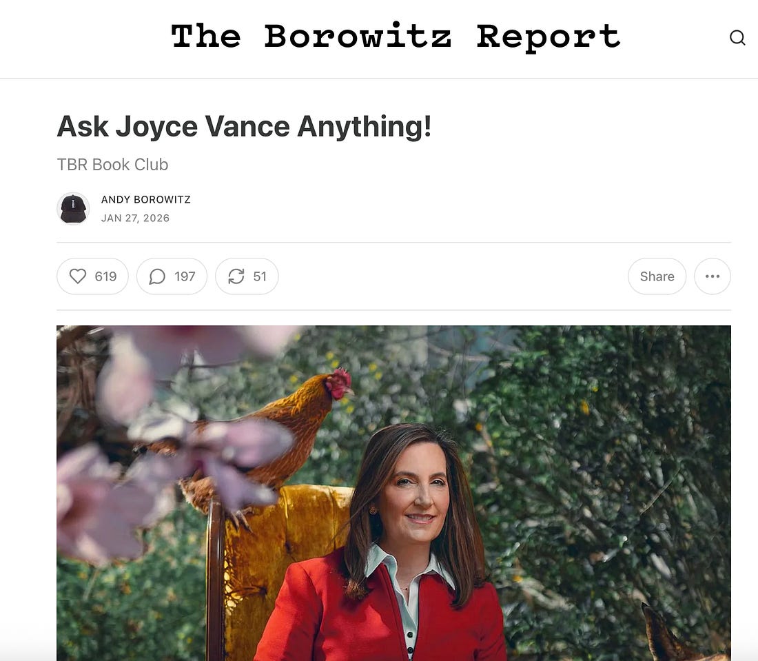 Most of you already know Andy Borowitz, of The Borowitz Report. If you don’t, you probably should. His recent posts have titles like, Trump Replaces Asshole with Alternate Asshole and Zelenskyy Suggests Trump Give Florida to Russia. He is a writer and comedian, best known for his satire. He explains his newsletter like this, “In 2012 The Borowitz Report moved to The New Yorker, which published it for the next eleven years. The column acquired readers around the world, including in the Chinese media, who believed a story I published about Donald Trump wrapping the White House’s phones in tinfoil.” As a longtime fan of his work, I’m so excited that he picked my book, Giving Up Is Unforgivable: A Manual For Keeping A Democracy, as his first TBR Bookclub pick for 2026. I’m just hoping I’ll feel that way after we do “Ask Me Anything,” which we’re taping on Wednesday, and which Andy will send out over the weekend. Will I have answers for all of his questions? Am I too boring to hang out with someone as funny as Andy? I guess we’ll find out. If you’re a paid subscriber to The Borowitz Report, you’re automatically a member of Andy’s book club. If you’re not, consider this a little heads up so you can join in time. We’re in this together, Joyce You're currently a free subscriber to Civil Discourse with Joyce Vance . For the full experience, upgrade your subscription. |