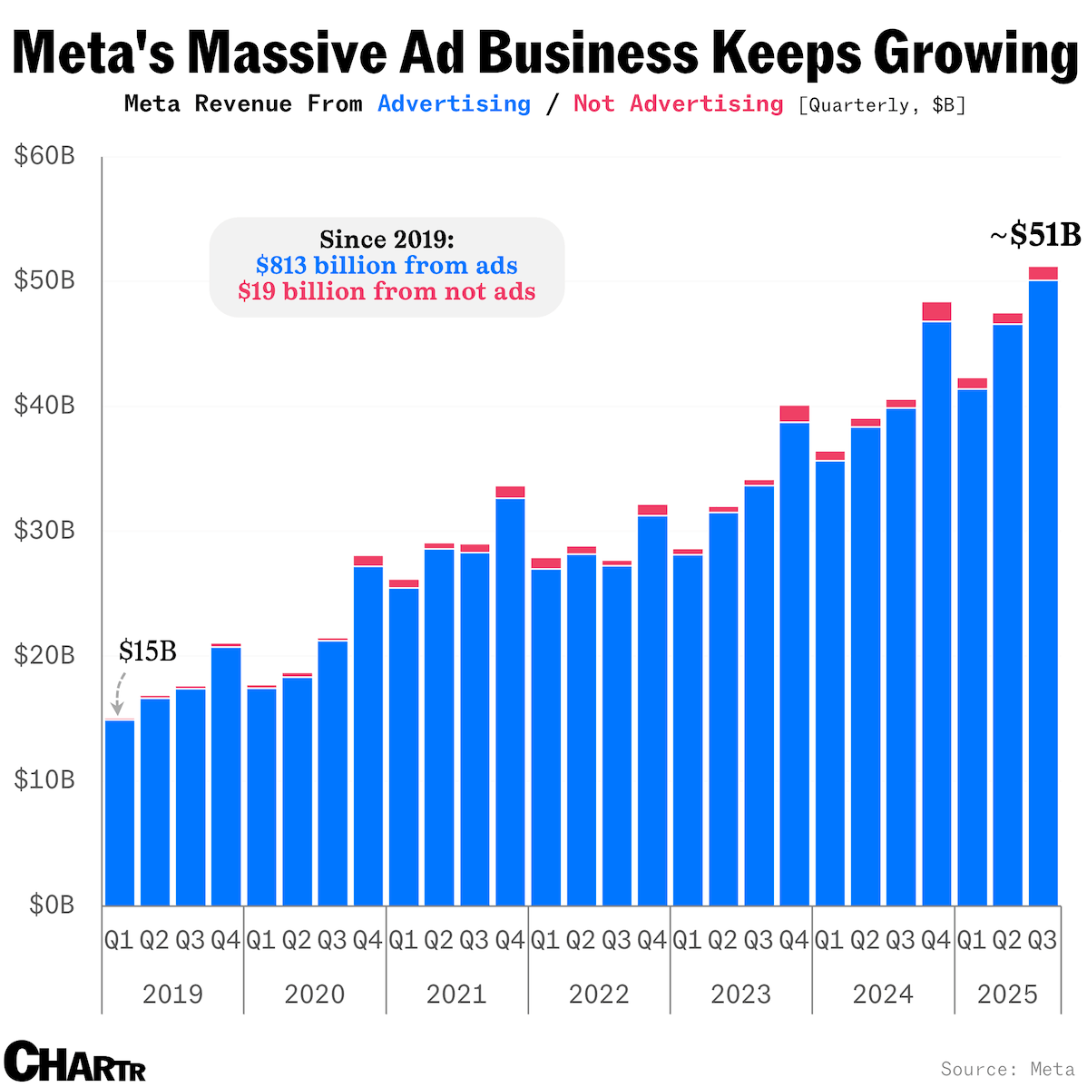 Still, unlike Spotify and Netflix, which actually pay for the content on their platforms and are only incrementally looking to advertising to juice up their bottom lines, Meta is already squeezing plenty of revenue from users without a paid subscriber model. In its third-quarter results back in October, the company reported total revenues of $51.2 billion — about $50 billion (~98%) of which came directly from advertising. |