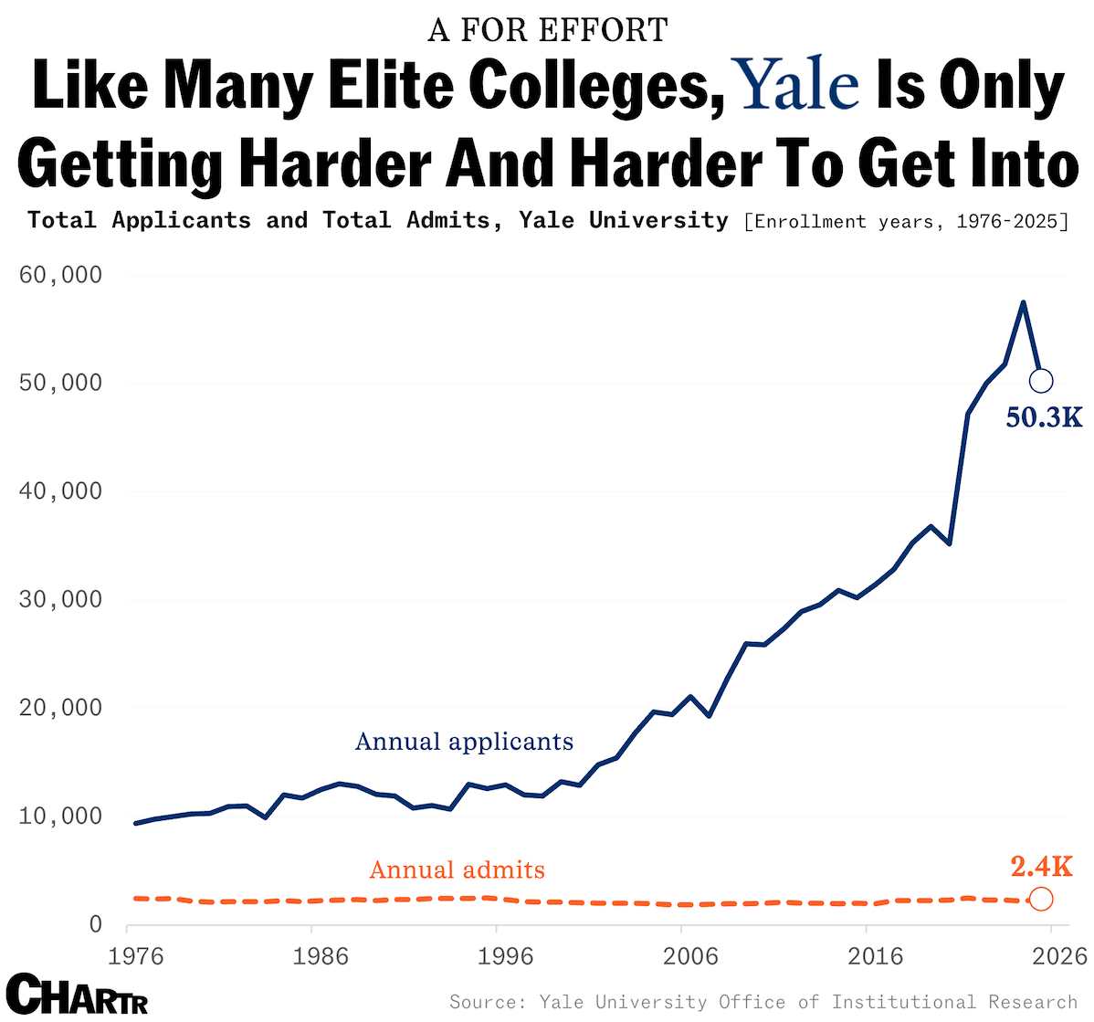 Though the total number of applicants dropped by more than 7,000 last year, as international applications plummeted 26% from the year before, it was still the third-biggest pool of hopefuls that the 325-year-old university had ever seen. Indeed, if you were gifted (and/or fortunate) enough to get in ahead of the 2025-26 academic year, you were part of a considerably more exclusive cohort than those who applied 30 years earlier — with roughly 1 in 20 applicants admitted in 2025, compared to one in five in 1995, per admissions data. While the aforementioned international student applicant slump, and the slew of data that suggests the decline isn't just hitting the most prestigious of America's universities, will displease deans across the country, it might come as some small relief to aspiring Yalies — particularly those whose parents earned $199,999 last year. |