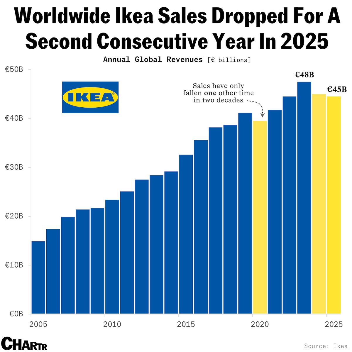 The world's go-to for DIY furniture is developing a new manufacturing hub of its own. On Monday, Ikea announced plans to more than double its investment in India to over 200 billion rupees (~$2.2 billion) across the next five years. Having only opened its first store there in 2018, online orders currently account for over 30% of the retailer's total India sales. But with plans to quintuple its store count in the country from 6 to 30, Ikea will be hoping that India can kickstart growth after a gloomy couple of years globally. Back in November, the Swedish furniture giant reported that its global retail sales declined to €44.6 billion (~$52 billion) in fiscal year 2025 — marking the second consecutive year that its global revenues have fallen, down 6% from the 2023 peak. |