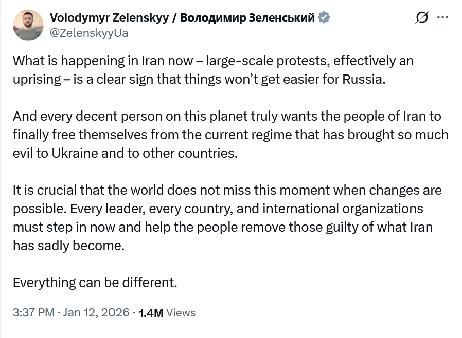 Yesterday I shared with you new polling that showed how much public opinion had swung against all this stuff in recent days, particularly after the murder of Renee Nicole Good, and why Democrats should be leaning hard into reforming and reining in ICE now. Here is some of that data again: Public opinion about this ICE terror regime is moving as we come to understand the barbarism of their tactics. In YouGov’s poll, above, released on Monday, abolishing ICE was 42%-45%. In it’s poll released yesterday with one more day of interviews it was 46%-43%. Yes it could be data bouncing around inside margin of error or it could be real movement as the public recoils in horror in what they are seeing. Listen to the great Jessica Tarlov on Fox News last night talk powerfully about the impact of what we are seeing with our own eyes, and watch the b-roll video shown as she speaks: I am still trying to process how Trump is encouraging the protestors in Iran while assaulting them - as the Iranian government is doing - here at home. Make this make sense please: On Iran, here is Congresswoman Ansari (whose parents fled the Iranian regime) on CNN last night calling on Congress and the President to do more than Truth to support the opposition, particularly as reports come in that the regime has killed tens of thousands of protestors in recent days: Here’s a statement for President Zelenskyy on the opportunity the world now has to weaken or end one of the most repressive governments in the world: “Everything can be different” echos my Sunday essay to all of you, Imagine Imagine If This Moment Was Not About The Ascent of Authoritarians, But About A New Birth Of Global Freedom. Just Imagine…. where I wrote: