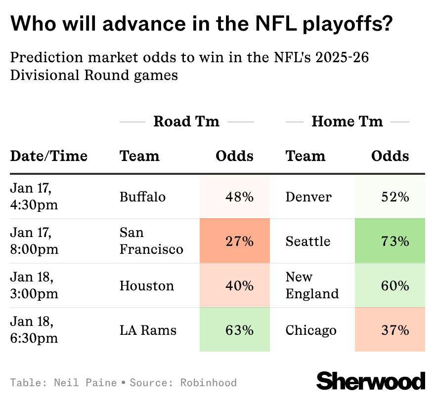 By the end of the weekend, we'll know the Final Four for this 2025-26 NFL season — and perhaps more than any recent season in recent memory, there's a lot of uncertainty around who'll be in that group of teams when the dust settles. For more data-driven sports insights, subscribe to our new Scoreboard newsletter. |