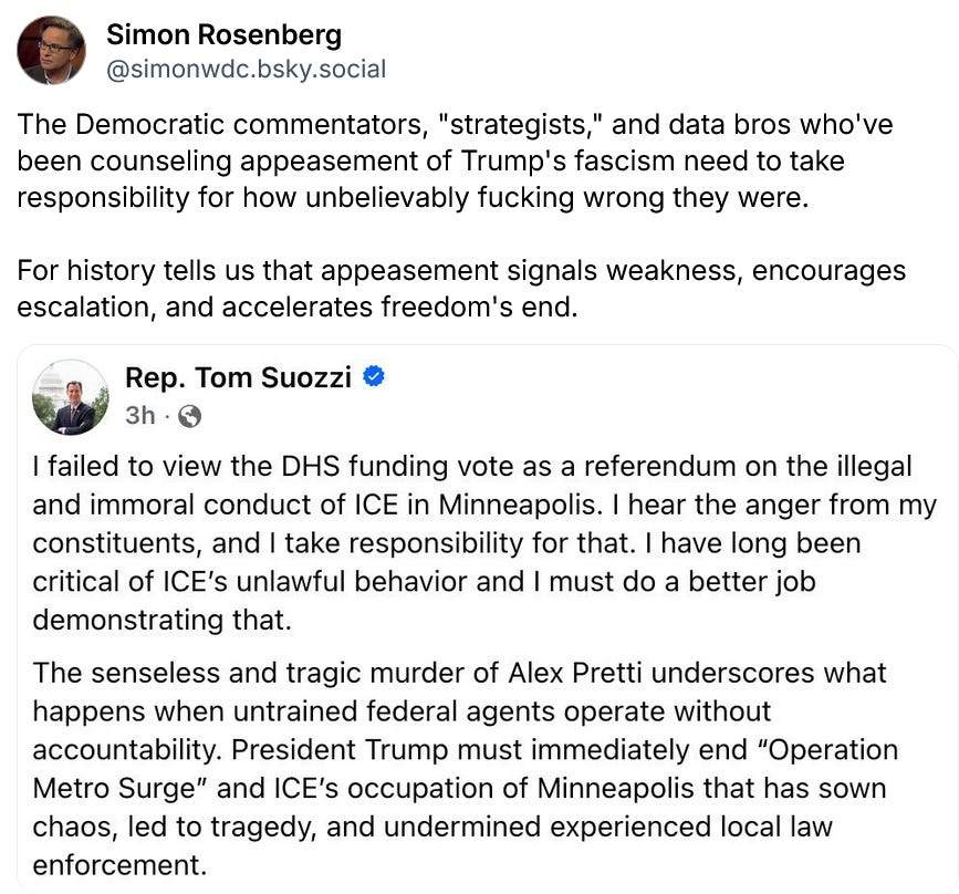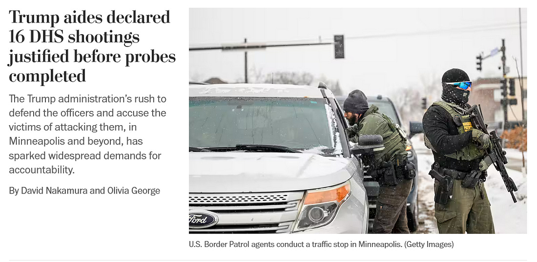 The Fight Ahead Of Us Is Not About Reining In ICE. It's About Reining In TrumpHopium paid subscribers gather tonight at 7pm ESTMorning all. First, congratulations. I think in Trump year one we’ve had remarkable political and electoral success. We’ve been winning elections of all kinds all across the country, some by enormous margins. Trump as a brand is deeply degraded. His economic agenda has failed. He was humiliated and humiliated himself on the global stage last week. His signature issue - immigration - has gone from asset to extraordinary liability. His Congressional coalition, and hold on the GOP, has begun to fray. The courage and bravery of the people of Minnesota has shown us the way forward, and inspired a nation. This is all good, and important. But we also know it’s not enough. In DC the talk is all about what do we do now that Dems have said they will not vote for the DHS appropriations bill this week without major reforms of DHS and ICE. Where does this go? What is the fight about? What is a reasonable outcome here? What does success look like? Greg Sargent has a new interview this morning with Senator Chris Murphy over at The New Republic. Here is how Greg summarizes what Senator Murphy told him about the fluid conversations happening inside the Senate Democratic Caucus now: Dems coalescing around 5 restrictions on ICE, I'm told: DHS required to cooperate with state probes (big) CBP stays at border warrants for arrests IDs, bodycams ICE out of churches, schools "That package unites a lot of Dems," Sen Chris Murphy tells me on the pod: newrepublic.com/article/2057... Tue, 27 Jan 2026 11:24:21 GMT View on BlueskyThese would be serious, and meaningful reforms if somehow the White House agreed to them, and DHS were to actually follow them. And that gets to the heart of the matter in front of us - Trump-Vance-Miller have already allowed/encouraged DHS to break Federal, state, and local laws. They are lying about only targeting criminals - they are detaining and deporting legal immigrants to the US. They are ignoring court orders in Minnesota right now. They have not been enforcing laws in Minnesota they’ve been breaking them. Essentially every agent on the ground in Minnesota has participated in a criminal conspiracy against American citizens. They should be viewed as criminals and not legitimate actors of our government. Like Trump himself. If you have not watched my recent interview with Glenn Kirschner you should. Or read the transcript. For what Glenn lays out, clearly and powerfully, is just how incredibly lawless this Minnesota campaign has been. Calling ICE or DHS a “law enforcement” organization is a joke. They made no attempt to follow the law while there. They were given permission to break the law, not follow it. That has been their training, and they have been following their training. So if we pass new law why do we think they will follow it? Here’s the lead story on the Washington Post home page right now: We have to remember that just a few weeks ago Trump, Vance, and Miller all told us, in public appearances, that they no longer believe that domestic or international law apply to them and the regime. That the regime was somehow OUTSIDE the law, the US Constitution, Senate ratified treaties, the UN Charter. All that stuff that came before - gone. They have renounced the very concept of law itself. Here’s Stephen Miller saying so on CNN, sentiments that were echoed by Trump in that now infamous NYT article the next day: So, what do we do? We think Trump is repentant today? ICE is still in Minnesota. Miller is still in essence the Prime Minister. A federal judge had to order, this morning, the head of ICE to appear in court on Friday for they continue to refuse to follow the law and clear judicial orders there: 👀 Judge Schlitz, the chief federal judge in Minnesota, has ordered the head of ICE, Todd Lyons, to appeal personally in court Friday and threatened him with contempt for the agency’s repeated violation of court orders. “The court’s patience is at an end.” storage.courtlistener.com/recap/gov.us... Tue, 27 Jan 2026 11:34:44 GMT View on BlueskyThe lawlessness we’ve seen in Minnesota is a manifestation of a much bigger problem - the staggering lawlessness of Trump and his regime. They’ve illegally vaporized government agencies. Killed people on the high seas. Cut foreign aid programs - illegally - that will end up killing 15 million people. His illegal tariffs have wrecked the economy here at home and alienated our allies and trading partners throughout the world. He has thrown innocent people into foreign gulags. Made a serious attempt to rip Greenland away from Europe, while also taking nominal or perhaps real control over both Gaza and Venezuela and helping Putin grab territory from Ukraine. He and his family are engaging in unprecedented self-dealing and corruption. He is desecrating national monuments and illegally building himself a gilded ballroom on the rubble of the East Wing. They’ve continue to illegally cover up for Epstein and all the crimes associated with him. Are we OK with all that? We gonna put up a fight about any of this in the coming months? So we are not OK with ICE acting lawlessly, but are we OK with all of this? And if not, what are we going to do about it? There is a strong argument for how Democrats have handled the fiscal year 2026 appropriations process. Passing 11 bi-partisan approps bills is a powerful re-assertion of Congress’s Article II powers, powers that Trump has attempted to seize in the past year. It helps restore an important part of what Trump and Vought have broken. But in doing so we made a decision to pass on the opportunity to challenge Trump on all these other illegal, criminal, and unconstitutional acts. I think what our Leaders have tried to do was reasonable and defensible. But it will only be seen as reasonable and defensible if we use this process of trying to rein in DHS/ICE t