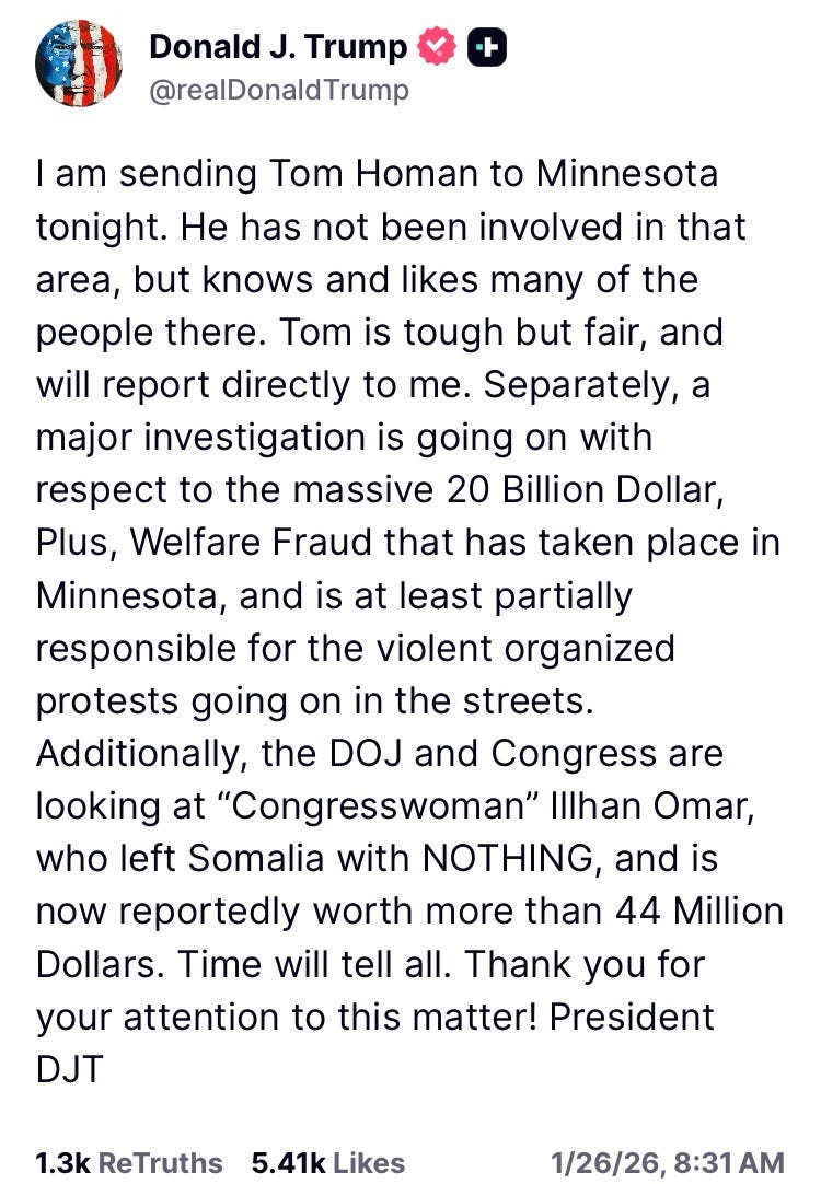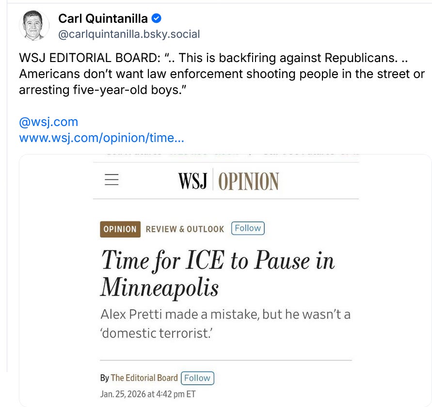 So could the White House change course? “President Trump fielded dozens of calls over the weekend from administration officials and senators,” WSJ’s Xavier Martinez reports, “with some worrying that public sentiment has turned against the administration’s immigration-enforcement actions. Some of the president’s aides have come to see the increasingly volatile situation in Minneapolis as a political liability and believe the White House should be looking for an off-ramp, according to administration officials. However, others in the administration believe that ending the current efforts in Minneapolis would be a capitulation to the left.”