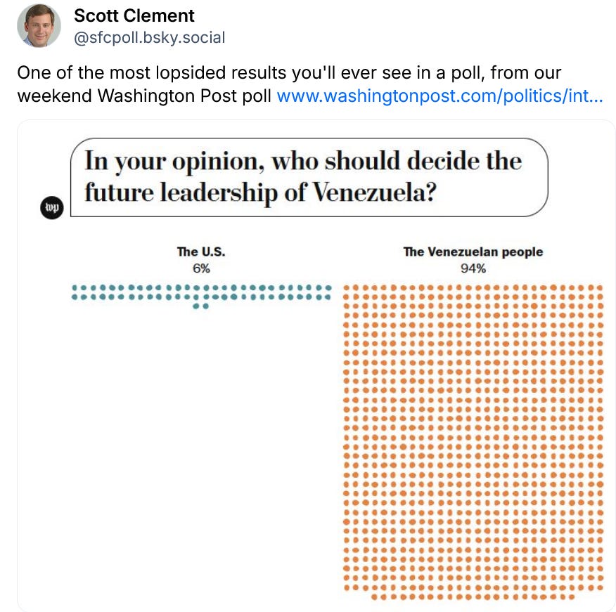All three polls are coming in at or below Trump's overall approval rating. Simply, this early data tells us that Americans are not rallying behind his Imperial flag, as they didn’t with his other recent strongman actions - the bombing of Iran and the invasion of American cities. As we discussed yesterday there is even less support in the early polling for the US “running” Venezuela.