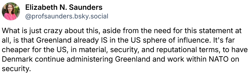 Here is what Dr. Elizabeth Saunders, Professor of Political Science & Director of the Saltzman Institute of War & Peace Studies at Columbia University, posted this morning about this statement and the Greenland madness: