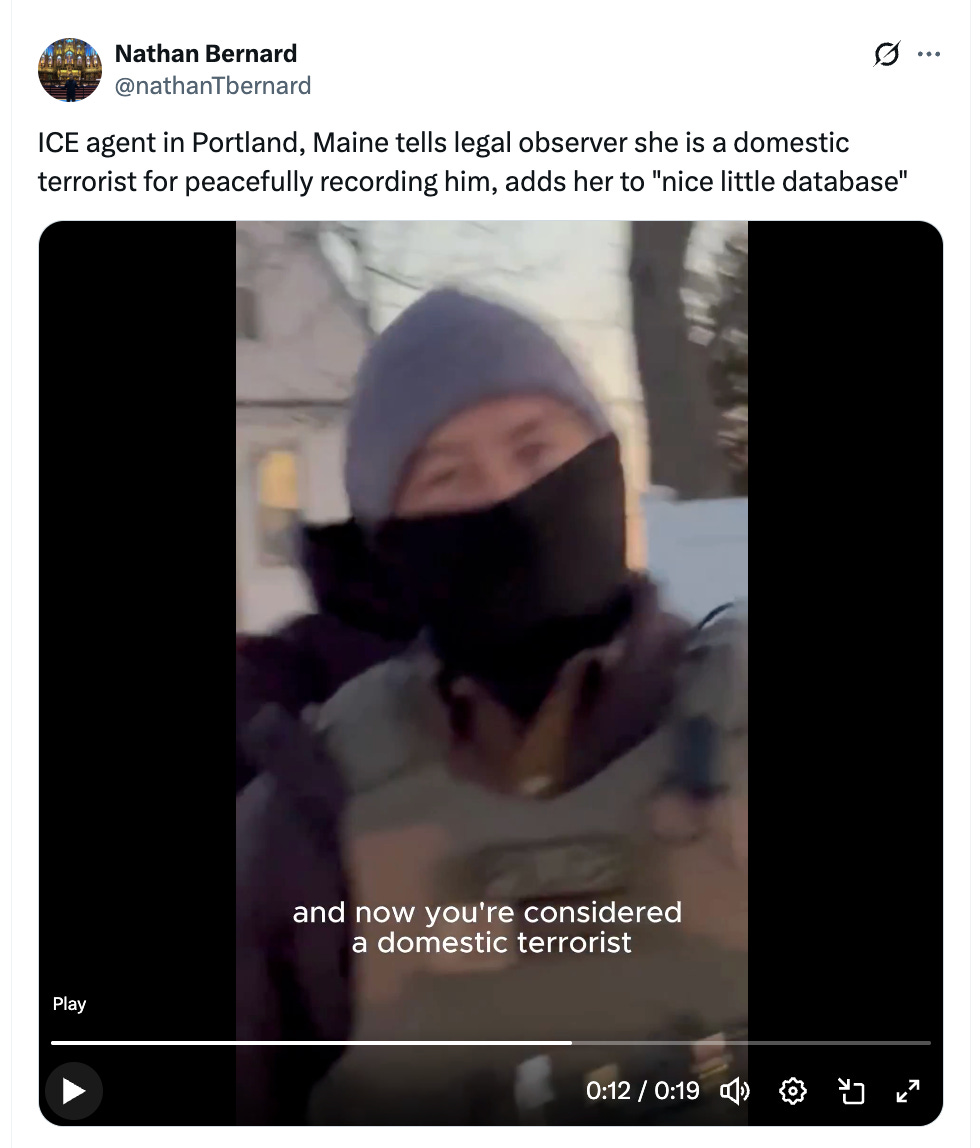 Mainers have been watching Minnesota. And they were prepared when ICE agents surged to Portland and Lewiston earlier this week. Saturday morning, Maine’s Secretary of State Shenna Bellows (she’s running for Governor) joins us for coffee at 8:30 am ET on a Substack Live to discuss what she’s seeing on the ground. Shenna has joined us in the past to discuss voting rights and election issues and I’m delighted we’ll have her with us in the morning. So far, Maine is standing for community. In Lewiston, people packed up food for delivery to their neighbors who were afraid to go out. The fear and intimidation are real as word spreads that ICE is indiscriminately picking up people who have legal status in the U.S. as they sweep the streets and even American citizens, if they’re the “wrong” color. The fear, it should go without saying, is a feature, not a bug. Today in Portland, Maine, ICE agents began videotaping people who were observing them. Apparently, they thought this was clever. When asked why they were doing it, the agent in the video below responds: “We have a nice little database.” “And now you’re a domestic terrorist.”