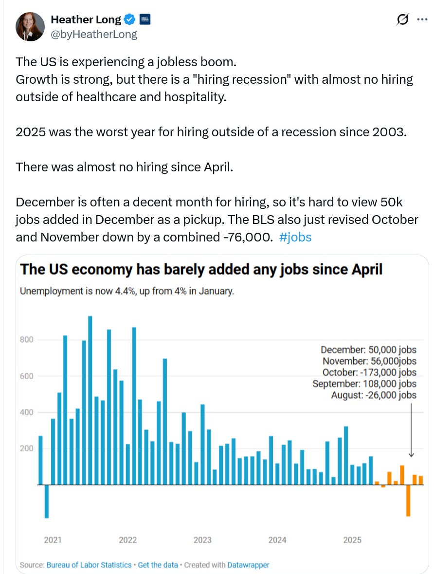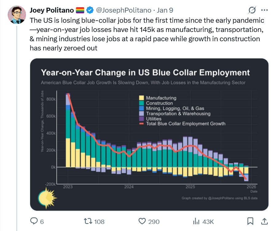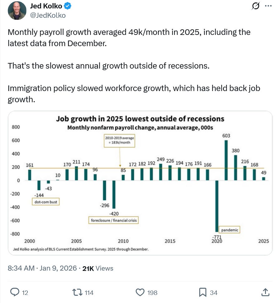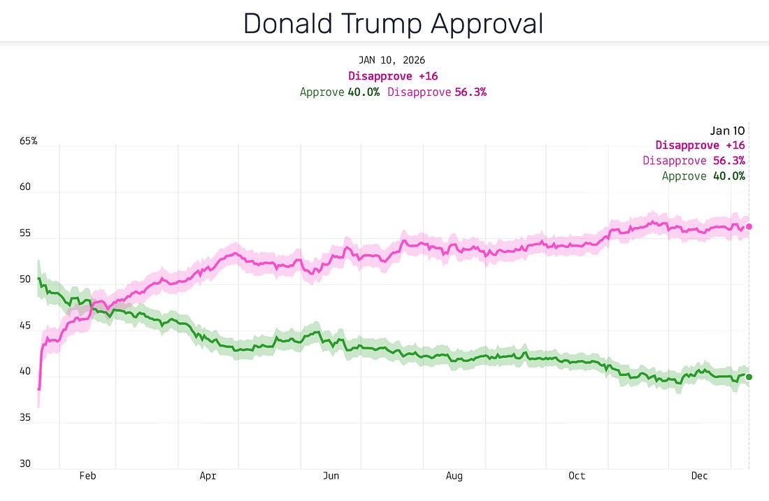Trump's Crap Economy, Their "Idiotic Gaslighting,"And A New Conversation With The Great Stuart StevensTake care of yourselves everyone. It's been a hard week.Morning all. My main offering this morning is a recording of a comprehensive conversation I had yesterday with the great Stuart Stevens of Lincoln Square. We touch on all the big issues of the moment - the killing of Renee Nicole Good, Trump’s crowning himself The Emperor Of The Americas, Russia’s capture of the Trump and the GOP, the need for our pro-democracy movement to keep finding a higher gear, and Trump’s domestic struggles and fraying Congressional coalition. We even lament Ole Miss’s tough loss on Thursday night. A recording of our talk is above and a rough transcript is here. I love these get togethers with Stuart. I always learn so much from him and promise you will too. Trump’s Tariff and Immigration Policies Have Stalled Out The Economy - 50,000 jobs created in December, 584,000 for the year, 49,000 on average per month this year. Biden saw 16.4m jobs created on his watch, 4.1m per year, 341,000 per month. Here’s economist Jed Kolko: Here’s economist Heather Long: Here’s another look at job growth in 2025 before and after the early May tariffs: Despite the bluster and the bullshit America is losing blue collar jobs for the first time since the pandemic: Consumer sentiment is the lowest in 65 years (via UMichigan): Americans remain very unhappy with Trump: My expectation is that we will get a lot of independent polling in the next two weeks which will tell us more about the public’s reaction to the killing of Renee Nicole Good and Trump’s lawless global ambitions. The only polls released this week with interviews after Good’s murder were not promising for Trump: