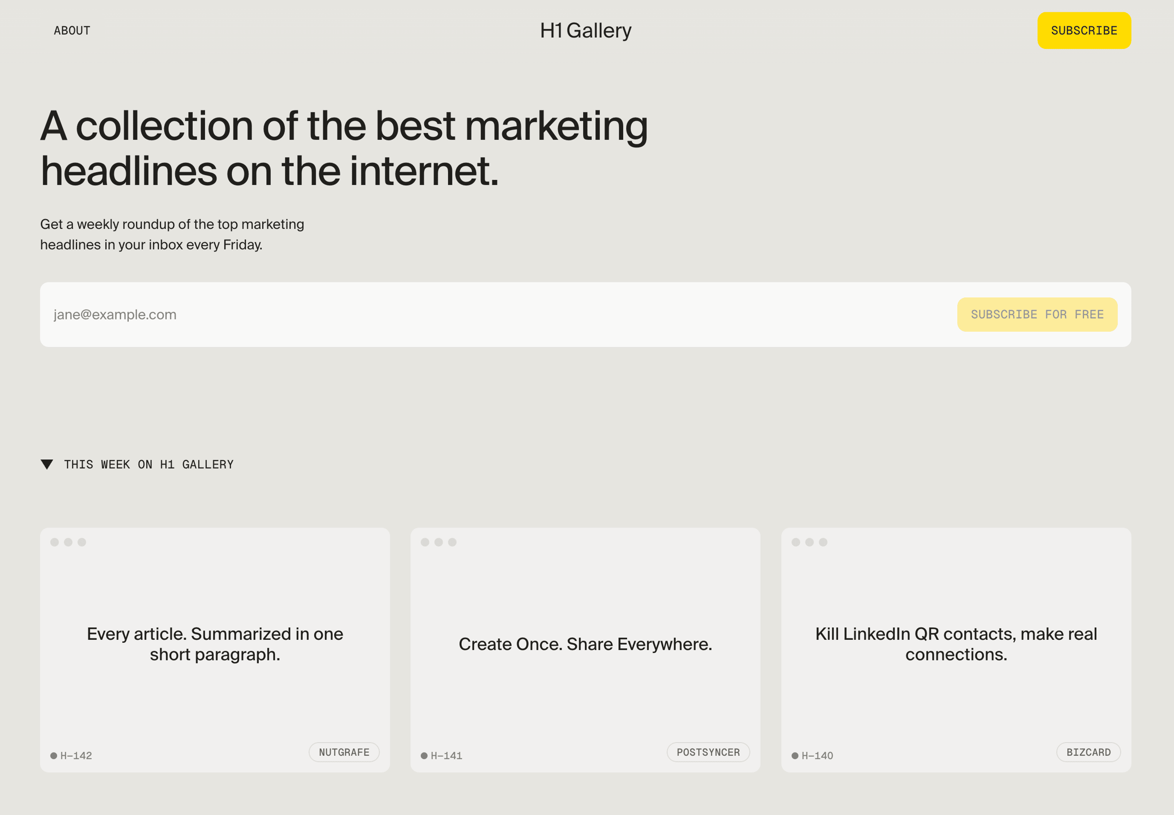 Quick announcement!My team and I have officially acquired H1Gallery, a weekly newsletter, and we are super excited. If you've followed my work for a while, you know I'm drawn to practical resources that make marketing decisions easier. H1Gallery fits that perfectly, and I'm excited to keep building it out. If you're not familiar with it, H1Gallery is both a newsletter and a curated collection of strong homepage headlines from SaaS startups.