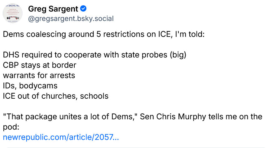 In the coming debate we have to more forcefully challenge the charade that their policy is about removing criminals. It’s never been about that. For if it is really only about removing criminals all this extra funding ICE has received in the big ugly isn’t needed. It is only needed to execute permanent occupations of our communities, and the threats and shakedowns that Bondi articulated this past weekend. The reason they keep lying about what they are doing is that they know, particularly after everything that has happened, that the public will not support a decade-long campaign of permanent occupation and terror. They’ve already lost that argument. And it’s why we have to keep pressing our leaders to fight as hard as they can in the coming days - for as we keep discussing, Republicans are increasingly weary, and wary, of defending the indefensible - and there is no way to defend their plan to have a decade of Minnesotas.