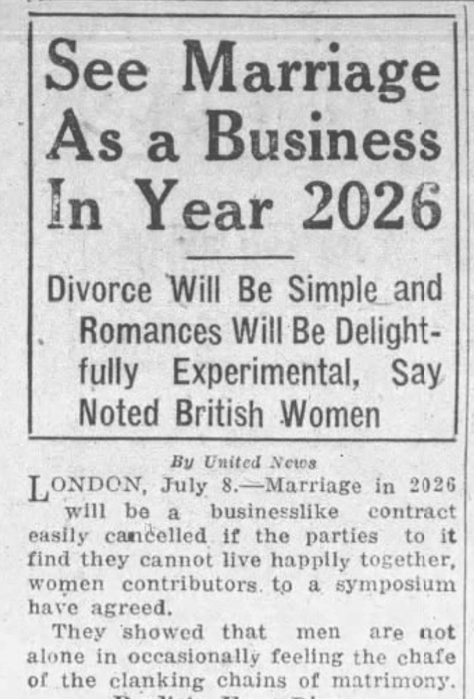 This article is fascinating. In 1926, a symposium of "noted British women" predicted the future of marriage. They believed it would become more "experimental" and "friendly", and that divorce would grow casual.