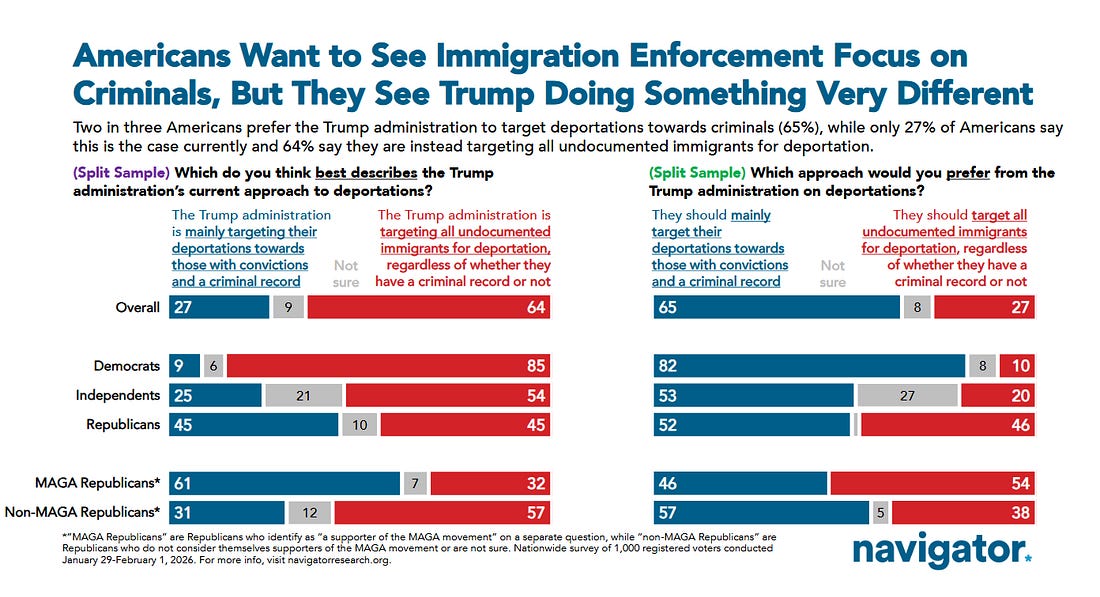 Americans Do Not Support Mass Deportation - We Must Stand Against ICE, And *For* The People ICE Is TerrorizingReining in ICE = end the violence, end the lawlessness, narrow the targetsMorning all. I want to start today with a moment that I think was critical in our finding our inner courage to truly take on ICE. It was a House hearing with Sec. Noem late last year, before the escalation in Minnesota, where Democrats so powerfully summoned their outrage against ICE’s barbaric behavior that Noem fled the hearing. To me the highlight of that hearing were remarks from Rep. Delia Ramirez which you can find above. Let’s start our day with her, her outrage, her fight, her righteous call for justice and accountability…… Reining In ICE - End The Violence, End The Lawlessness, Narrow The Targets - So I’ve come up with a new way of describing our campaign to rein in ICE -