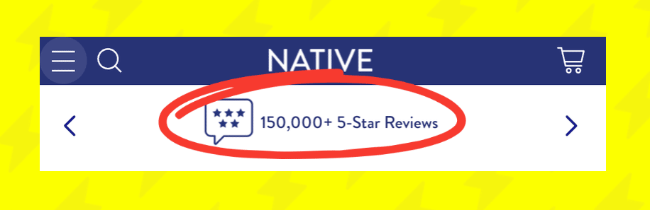 E-commerce Lead with your standout stat Native displays an impressive stat "150,000+ 5-star reviews" across their site instead of cherry-picking a handful of glowing but generic testimonials. That massive number becomes your reference point, so you don't wonder how many customers Native actually has in comparison.